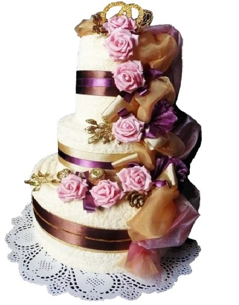 Красивый и оригинальный подарок на свадьбу и юбилей – практичный и элегантный комплект из 4-х полотенец в форме торта с богатым цветочным декором.