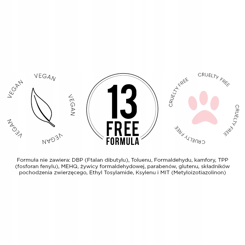 Формула 13 FREE не содержит вредных ингредиентов, таких как: DBP (дибутилфталат), толуол, формальдегид, камфора, TPP (фенилфосфат), MEHQ, формальдегидная смола, парабены, глютен, ингредиенты Животное происхождение, этилтозиламид, ксилол и MIT (метилизотиазолинон).