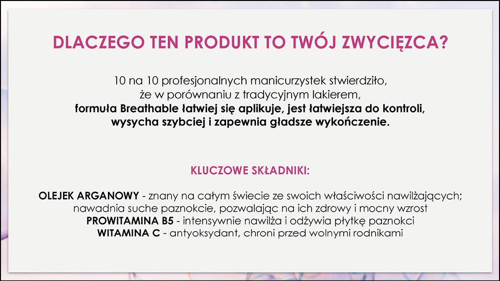 В отличие от традиционного лака для ногтей, Breathable благодаря формуле Advanced Oxygen Technology создает на ногтях проницаемый слой, позволяющий кислороду и воде проникать через ногтевую пластину к ногтевому ложу.