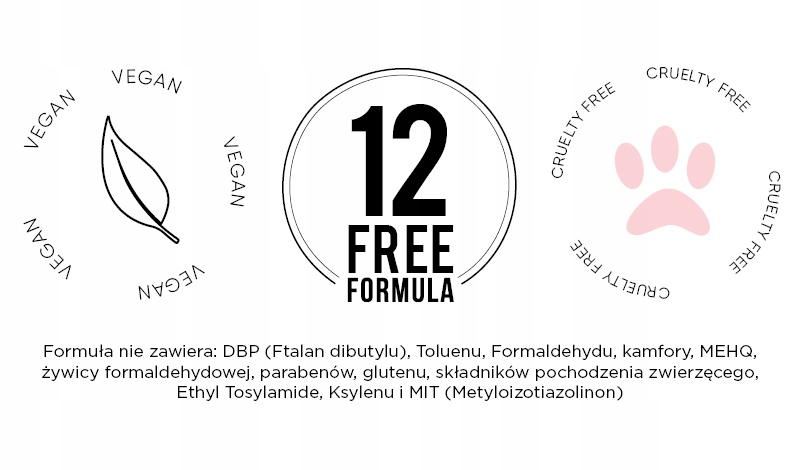 Формула 12 FREE не содержит: DBP (дибутилфталат), тулен, формальдегид, камфору, MEHQ, смолы формальдегидные, парабены, глютен, ингредиенты животного происхождения, этилтозиламид, ксилол и MIT (метилизотиазолинон).