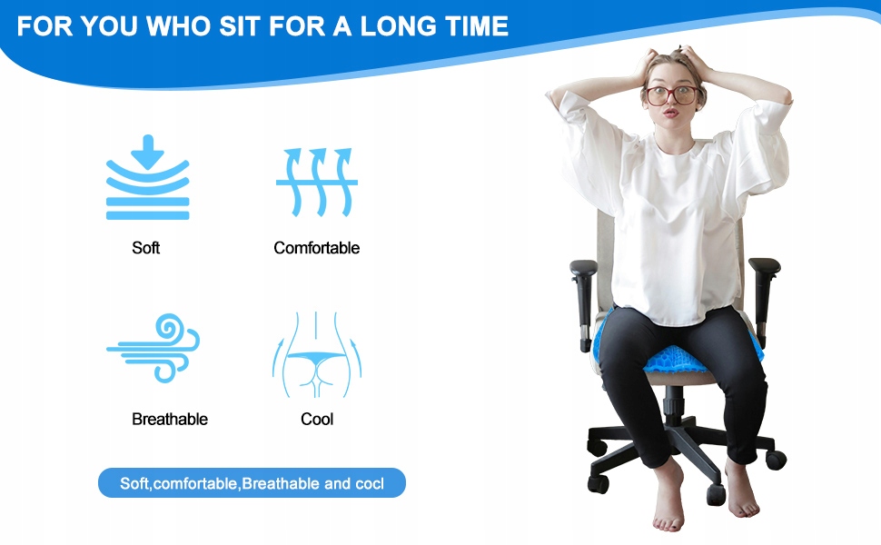 【Наслаждайтесь охлаждением】 Наша подушка сиденья изготовлена из толстого геля с сотовой структурой, которая увеличивает поток воздуха, обеспечивая максимальный комфорт охлаждения, предотвращает потливость сиденья и вентиляет сетку, которая не нагревается, что не нагревается на модели с термоластической пеной. Идеально подходит для людей, которые сидят долго.
