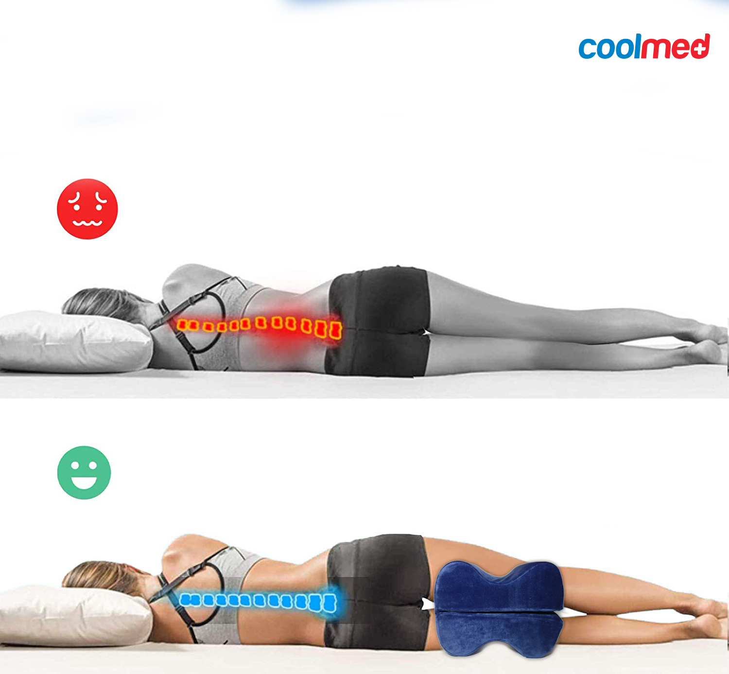 Подушка Coolmed создана для того, чтобы обеспечить правильное положение спины и разгрузить позвоночник во время сна. Когда вы спите, вы спите на боку, а нога, которая находится сверху, выдвигается вперед. Это оказывает давление на бедра и заставляет таз вращаться, а поясницу скручивать. Такое неправильное положение позвоночника оказывает давление на позвонки и связки.