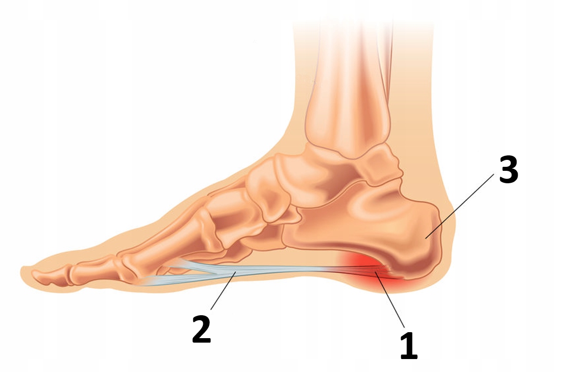 Внезапное разгибание стопы в положении стоя приводит к сильному растяжению напряженных мышц и фасций (2) >, что вызывает появление боли в области пятки (3).