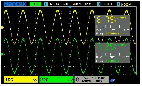 Новая серия осциллографов DSO2000 Hantek: DSO2D15 — цифровой осциллограф, предлагающий два входных канала с полосой пропускания 150 МГц и дополнительно встроенный генератор функций с максимальной Частота сигнала 25 МГц. Осциллограф имеет преобразователь с частотой дискретизации 1Гвыб/с и памятью 8М. Программное обеспечение управления осциллографом обеспечивает автонастройку AUTOSET, автоматическое измерение 32 параметров напряжение-время, декодирование последовательной шины, анализ БПФ, работу в режиме X-Y, запись сигналов и связь с ПК. Поддерживает команды дистанционного управления SCPI.