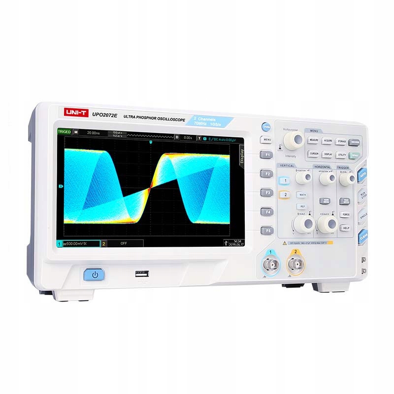 UPO2072E — двухканальный цифровой осциллограф производства Uni-t. Осциллограф UPO2072E оснащен технологией отображения Ultra Phosphor, обеспечивающей до 256 уровней яркости дисплея, что является отсылкой к аналоговым осциллографам (люминофорным). Каждый из аналоговых входных каналов осциллографа имеет полосу пропускания 70 МГц. Частота дискретизации преобразователя до 1 Гвыб/с, длина записи в памяти до 56 МБ выборок, очень высокая частота обновления до 83 000 осциллограмм/секунду удовлетворят требования самых требовательных пользователей.
