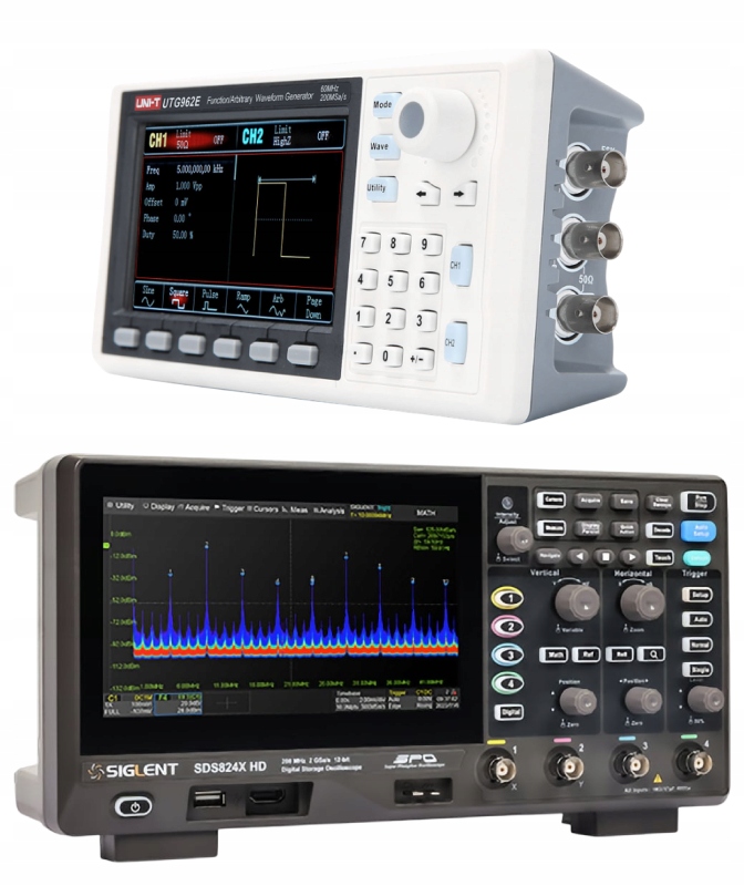 Акционный комплект измерительных приборов, состоящий из четырехканального цифрового осциллографа SDS804X-HD и двухканального функционального генератора UTG932E.