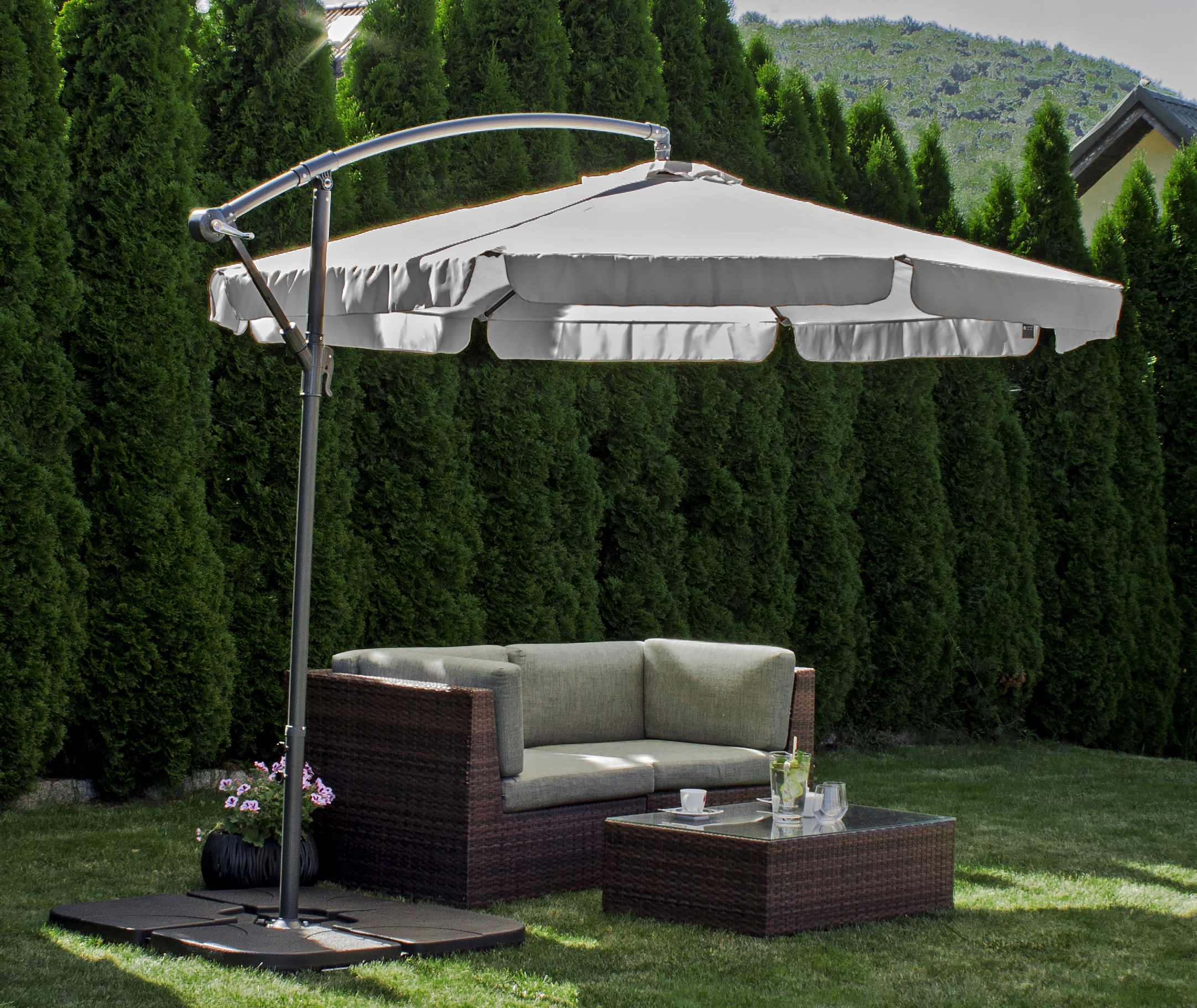 Предлагаемая модель отличное предложение для любого сада, террасы или балкона. Основание, состоящее из четырех независимых элементов, обеспечит стабилизацию каждого зонта на поперечной раме.
