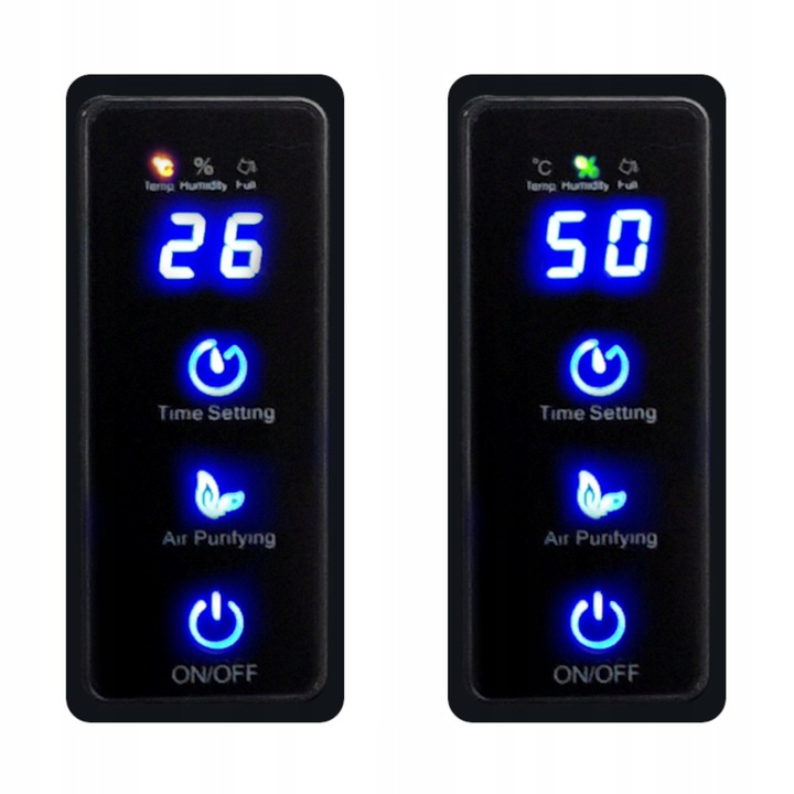 Осушитель воздуха имеет понятную и удобную сенсорную панель управления с синей светодиодной подсветкой. Благодаря встроенным термометру и гигрометру во время работы он показывает текущую температуру попеременно с текущей влажностью воздуха окружающей среды, в которой он находится.