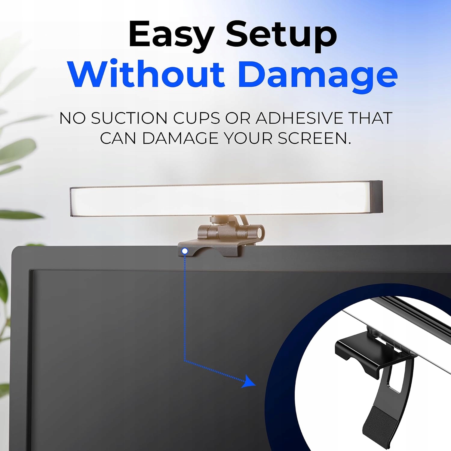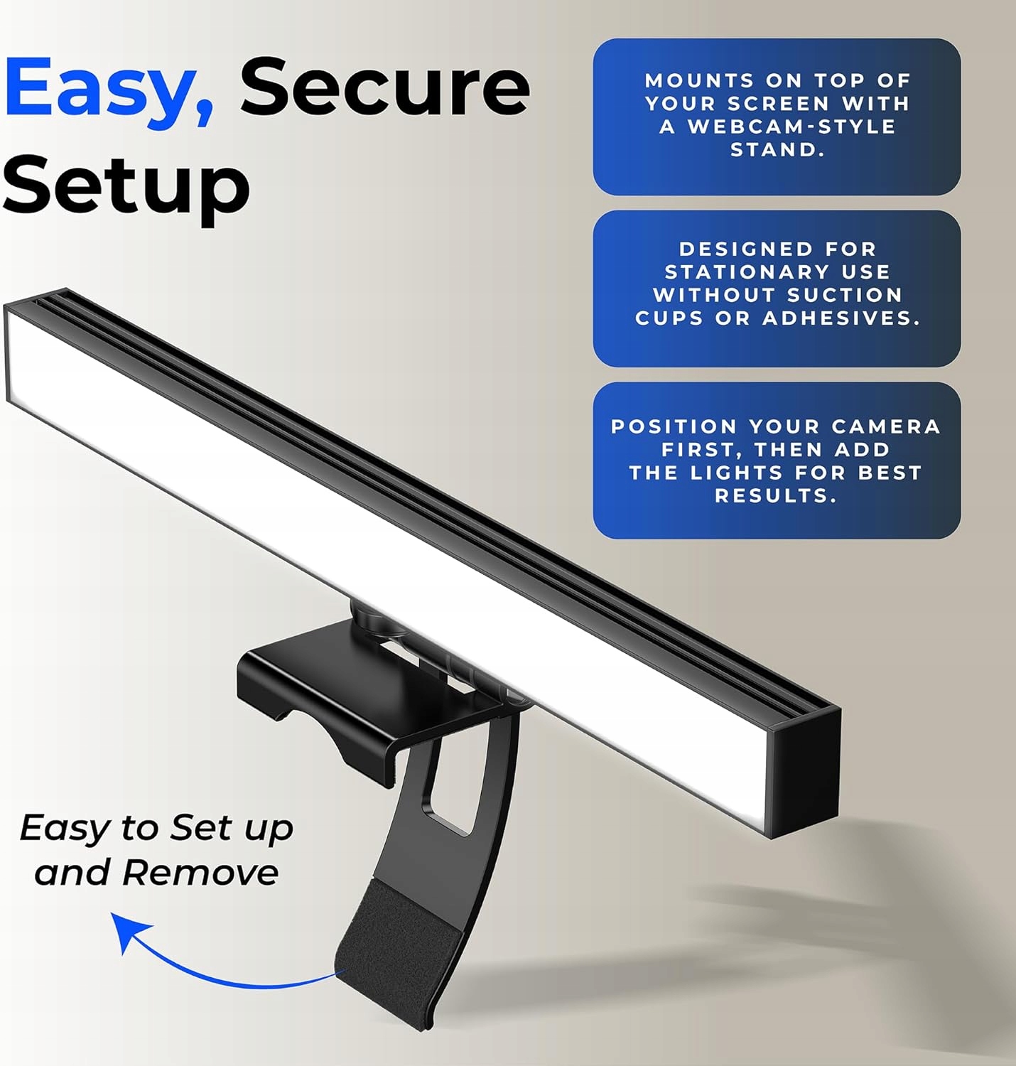 Простая настройка и удаление: монитор или лампа для ноутбука расположены в верхней части экрана с подставкой для веб -камеры. Он предназначен для стационарного использования и не использует невероятные всасывающие чашки или вредный клей только для компьютерного освещения. Сначала поместите камеру, а затем добавьте огни монитора.