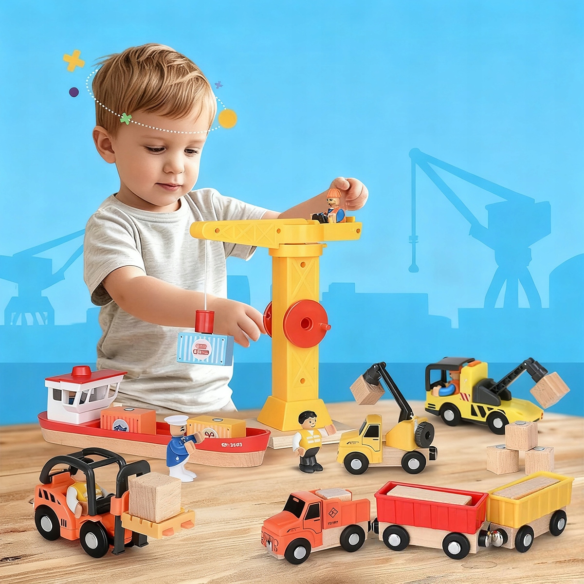 Этот деревянный игрушечный набор изображает реалистичную портовую среду - с краном, кораблем, контейнерами, вилочными погрузчиками и грузовиками. Различные элементы способствуют изучению логистики и стимулируют воображение и ловкость.