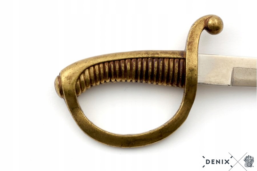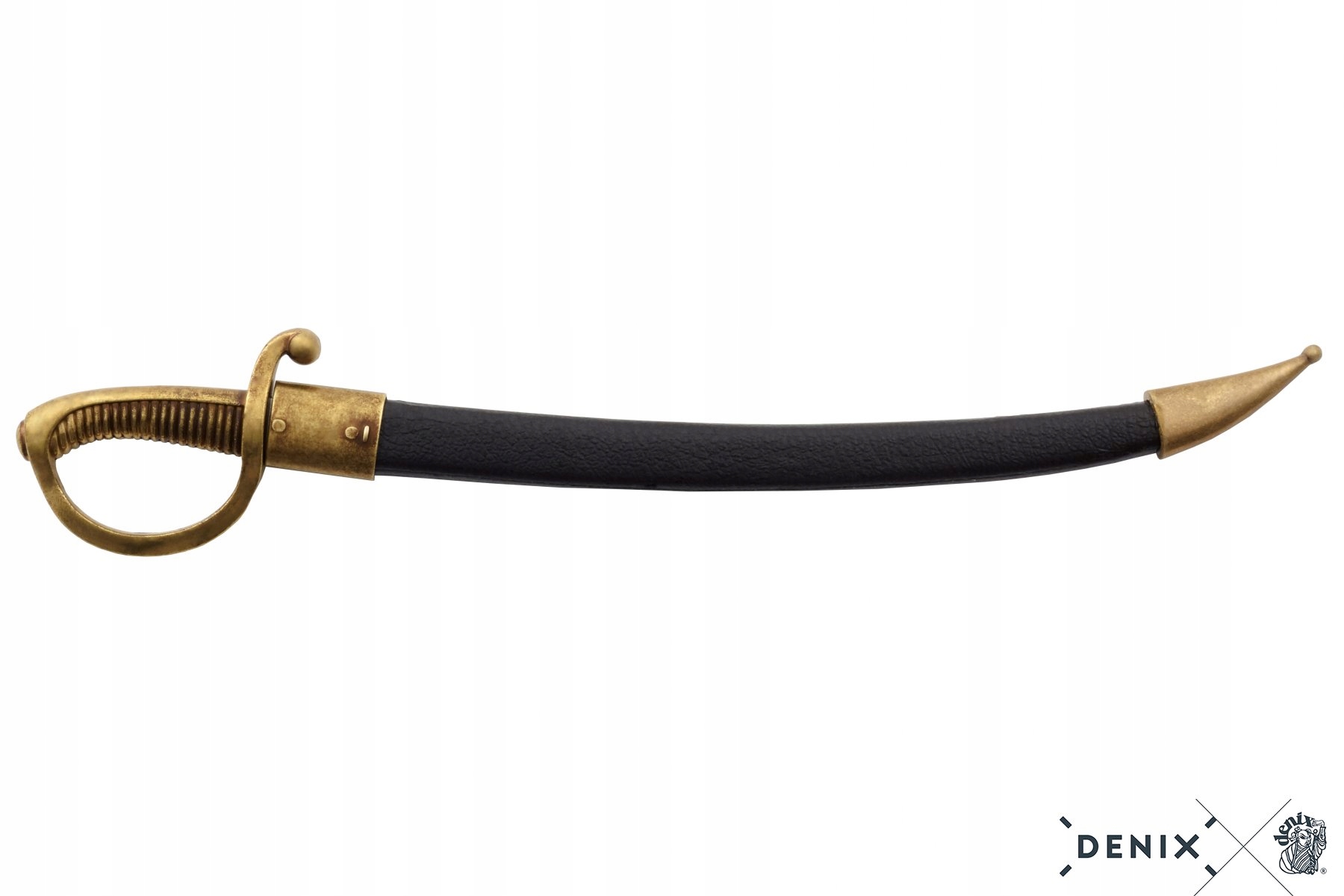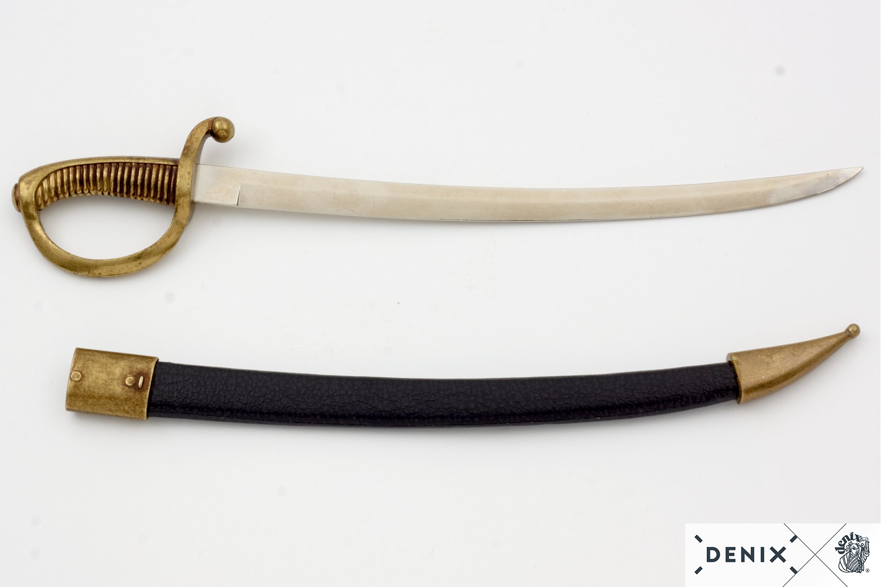 Представляем нож для писем в элегантных ножнах, который представляет собой миниатюрную копию наполеоновской сабли XIX века, которая была оружием французской пехоты во время всех наполеоновских войн. Характерную форму рукоятки можно встретить не только по всей Европе, но и в США.Лезвие изготовлено из дутой, незакаленной, блестящей хромированной стали. Ручка - оцинкованная. Ножны обтянуты черной искусственной кожей, декорированной с обеих сторон. Точно выполненные детали отражают дух эпохи. Идеально подходит для любого любителя времен Наполеона. Он красиво украсит любой офис и станет отличным подарком.