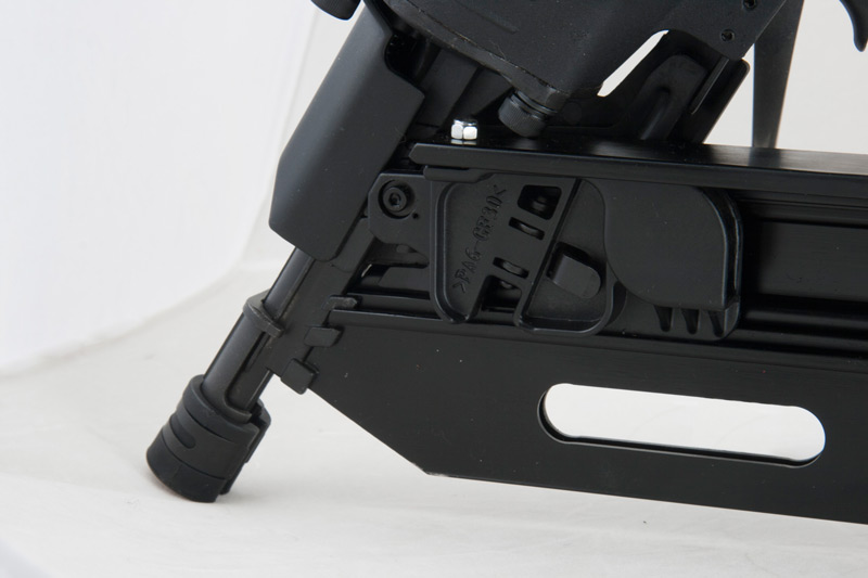 Магазин с задним заряжанием изготовлен из алюминия, что делает его более прочным и невероятно легким. Специально разработанный кончик носика снижает износ и ограничивает смещение кончика даже при забивании гвоздей под углом. Резиновая крышка на наконечнике магазина и с обеих сторон корпуса инструмента дополнительно защищает пользователя инструмента и заготовку. Также гвоздезабиватель отличается возможностью установки направления выхода воздуха в любом выбранном направлении (вращение на 360 градусов).