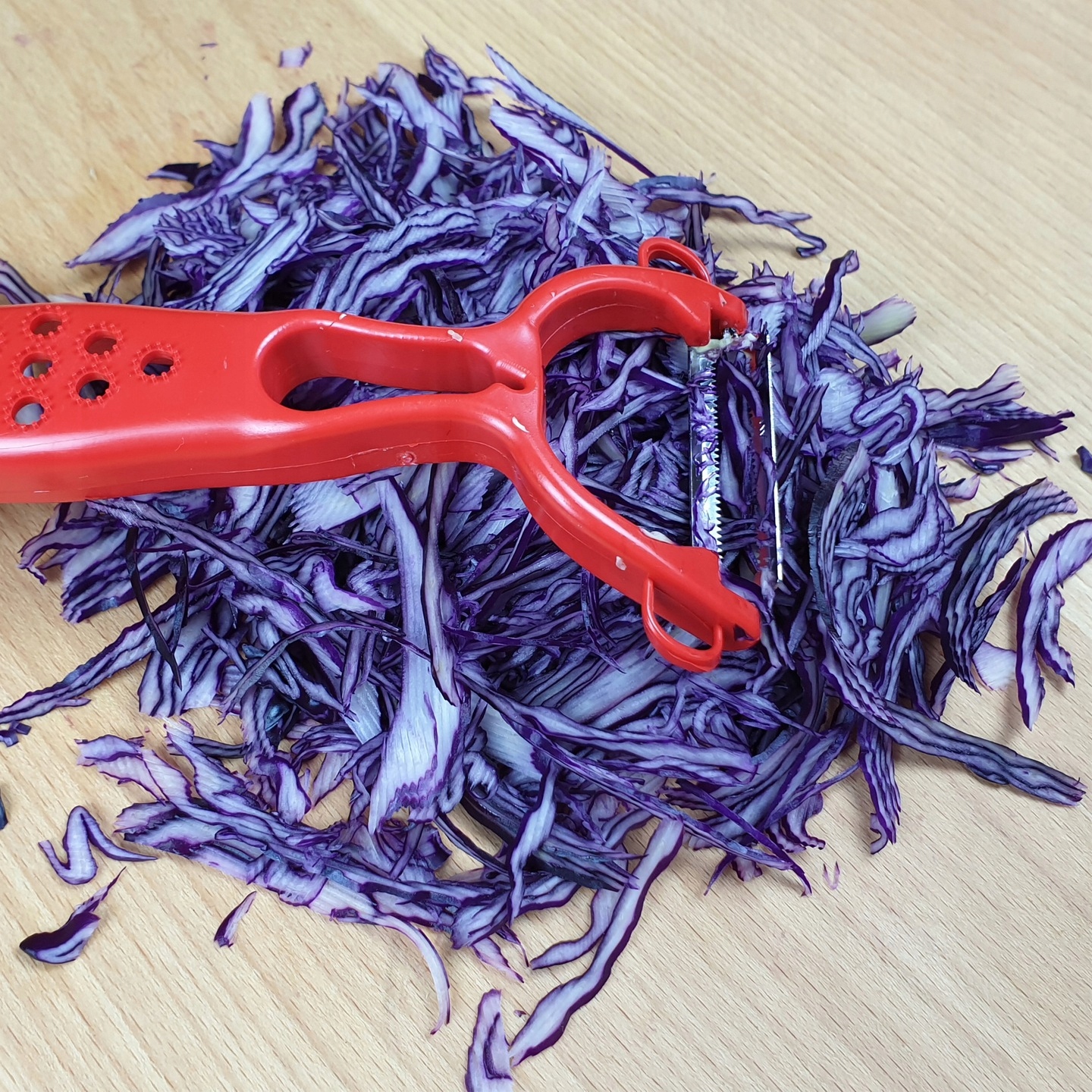 Очистка оснащена лезвиями с обеих сторон, как показано на рисунке. фотографии. С одной стороны очень острое, нетупое, зубчатое лезвие. С помощью которого можно очень тонко очистить овощи и фрукты. Вы также можете шинковать как белокочанную, так и красную капусту. Устройство работает в обе стороны.
