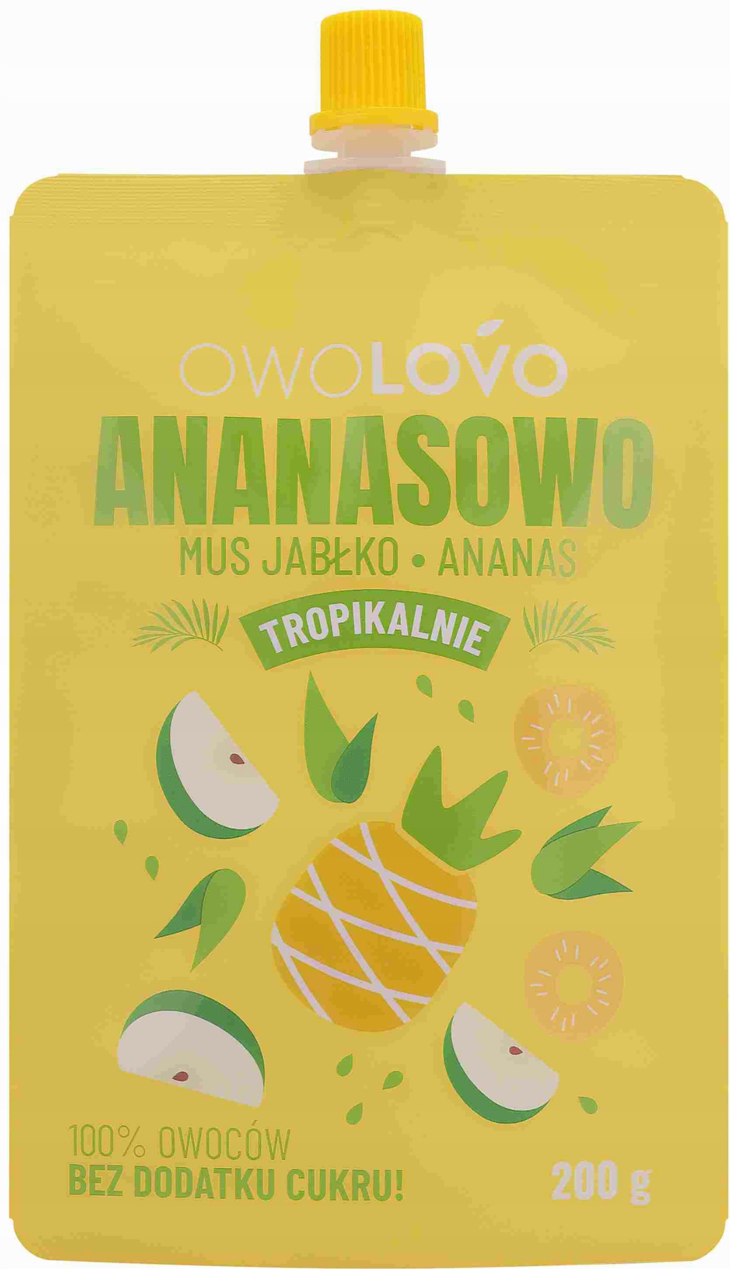 OWOLOVO Фруктовое пюре. Специально для вас мы создали уникальное сочетание солнечных тропиков и польской сладости. Наслаждайтесь свежестью и натуральным вкусом яблока и ананаса. Позвольте себе удивиться этому экзотическому наслаждению, состоящему из 100% фруктов!