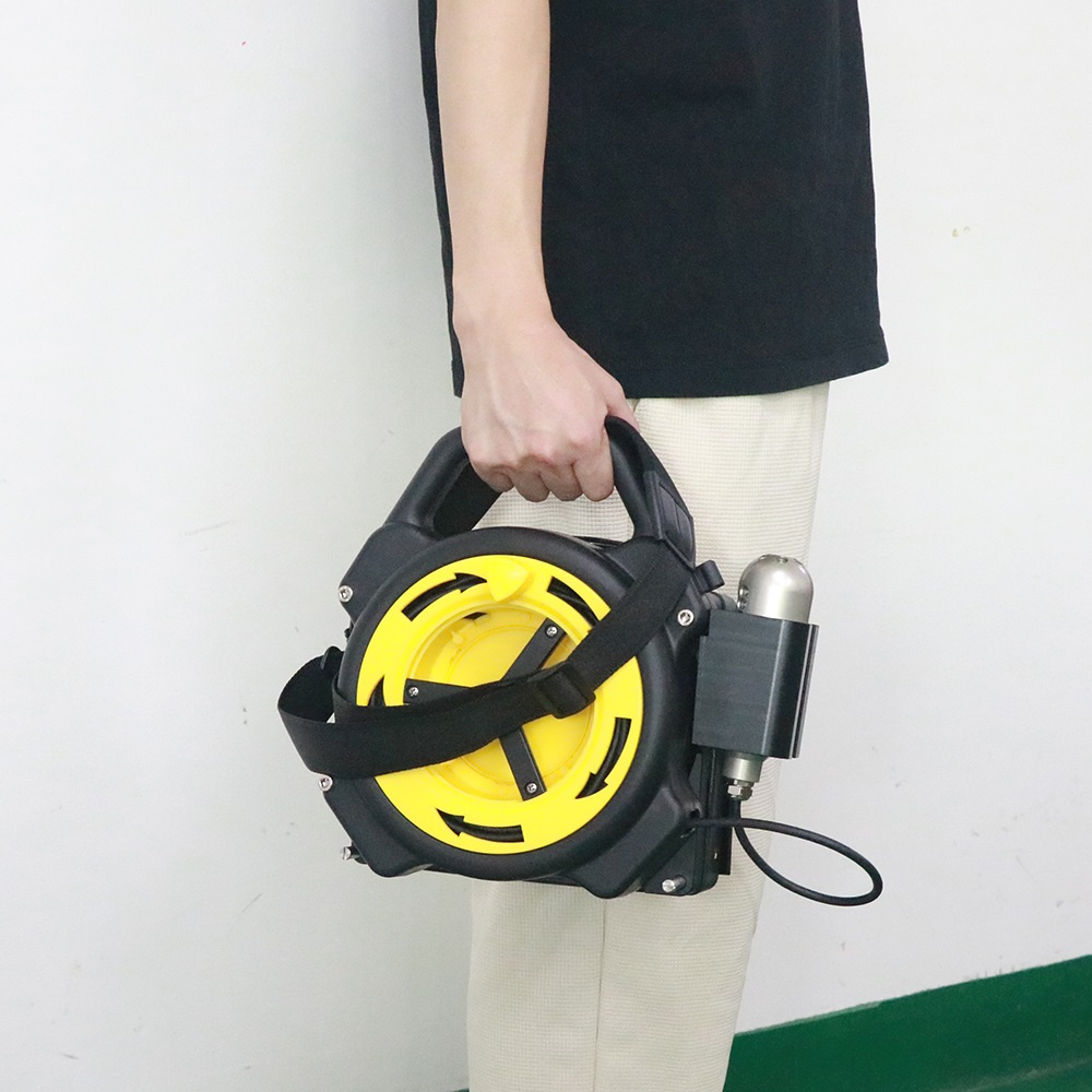 Система поставляется с гибким кабелем длиной 20 м, который обеспечивает легкий доступ даже к самым маленьким помещениям. Кабель аккуратно спрятан в корпусе агрегата, что повышает комфорт при транспортировке и хранении. Функция расстояния в размотке дает точную информацию о том, сколько метров кабеля уже размотано. Кабель оснащен двойной головкой камеры, которая позволяет одновременно осуществлять прямой и боковой обзор с поворотом на 360° для максимального охвата пространства. Есть записанное видео