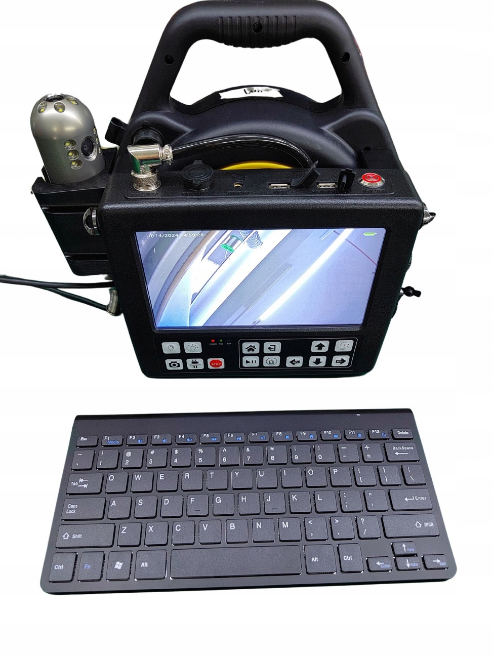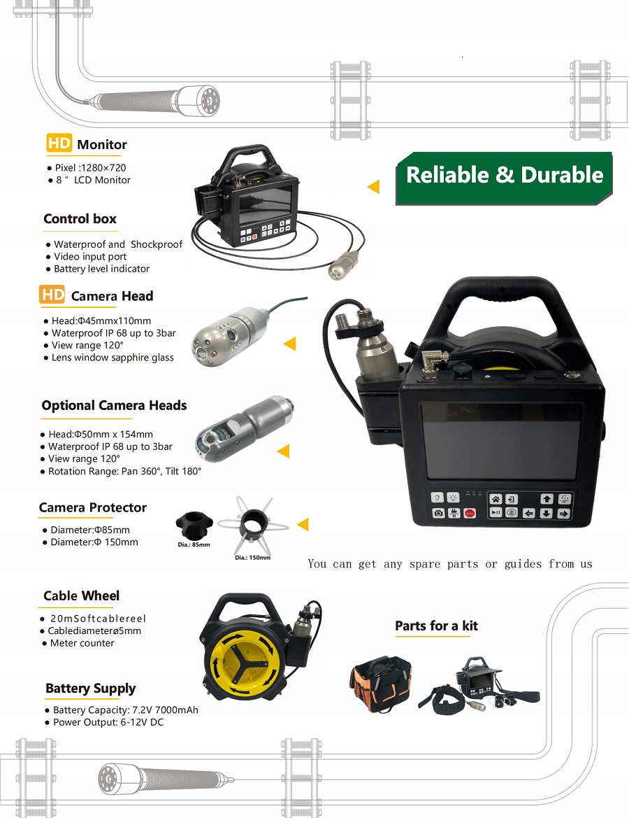 Головка камеры HD с двойным обзором: обеспечивает одновременный прямой и боковой обзор с поворотом на 360° для максимального охвата пространства. Четкое изображение HD (1920 x 720 пикселей): обеспечивает четкое и детальное отображение во время проверки. Запись на цифровой видеорегистратор: видео, фотографии и аудио легко сохраняются на входящем в комплект USB-накопителе (32 ГБ). Гибкий кабель 20 м: стандартный кабель диаметром 5 мм и длиной 20 м позволяет удобно использовать его даже в ограниченном пространстве. Прочная головка камеры из нержавеющей стали: размеры 45 x 110 мм обеспечивают высокую прочность. 8-дюймовый цветной ЖК-монитор: обеспечивает четкое изображение в реальном времени для точного управления. Совместимость с беспроводной клавиатурой: упрощает работу и создание заметок во время записи. Аккумулятор: идеально подходит для использования в полевых условиях без необходимости подключения к сети (время работы примерно 4–5 часов). Водонепроницаемый и противоударный: обеспечивает надежность даже в сложных условиях. Сверхяркое светодиодное освещение: обеспечивает отличную видимость даже в темноте (3 уровня интенсивности света). Вращение на 360°: обеспечивает полный охват области проверки.