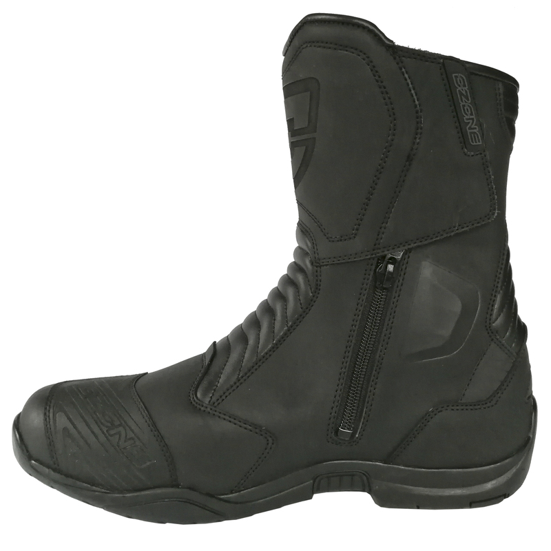 Кожаная мотоциклетная обувь с резиновой подошвой и полиэфирной сеткой. У них водонепроницаемый, дышащий хипора, жесткий наконечник и укрепление под рычагом передачи. Закреплен с двойным замком и липучкой. Антибактериальная стелька и гибкие панели увеличивают комфорт использования.