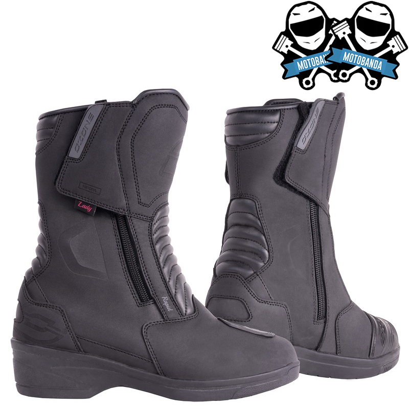 Мотоциклетные туфли быстрого высокого высокого уровня предназначены для женщин. Благодаря повышенному каблуке и внутреннему клину, вам не придется опускать мотоцикл, и ваш силуэт оптически расширится. Rapid High также имеет хипора мембрану и подкрепление под рычагом передачи.