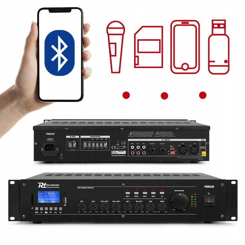 Power Dynamics PRM240 — это усилитель 100 В, который благодаря множеству опций и возможностей идеально подходит для звуковых систем и музыкальных инсталляций. Усилитель имеет Bluetooth для беспроводной потоковой передачи музыки со смартфона или планшета. В комплект также входит встроенный MP3-плеер, позволяющий легко воспроизводить списки воспроизведения, хранящиеся на USB-накопителе или SD-карте, при этом на дисплее отображается тег ID3 (информация о названии/исполнителе). Усилитель имеет 4 входа для подключения аудиооборудования, такого как (музыкальный) компьютер, ноутбук, проигрыватель компакт-дисков и т. д., а также 2 дополнительных входа для подключения микрофона. При необходимости 2 аудиовхода можно переключить на микрофонный вход, что позволяет подключить 4 микрофона. Усилитель также имеет 4 зоны, которые можно включать и выключать индивидуально. Таким образом, PRM240 идеально подходит для использования в качестве звуковой или музыкальной системы, например, на складах или в заводских цехах, а также может служить центральным устройством для магазинов, ресторанов и т. д., обеспечивая атмосферную фоновую музыку.