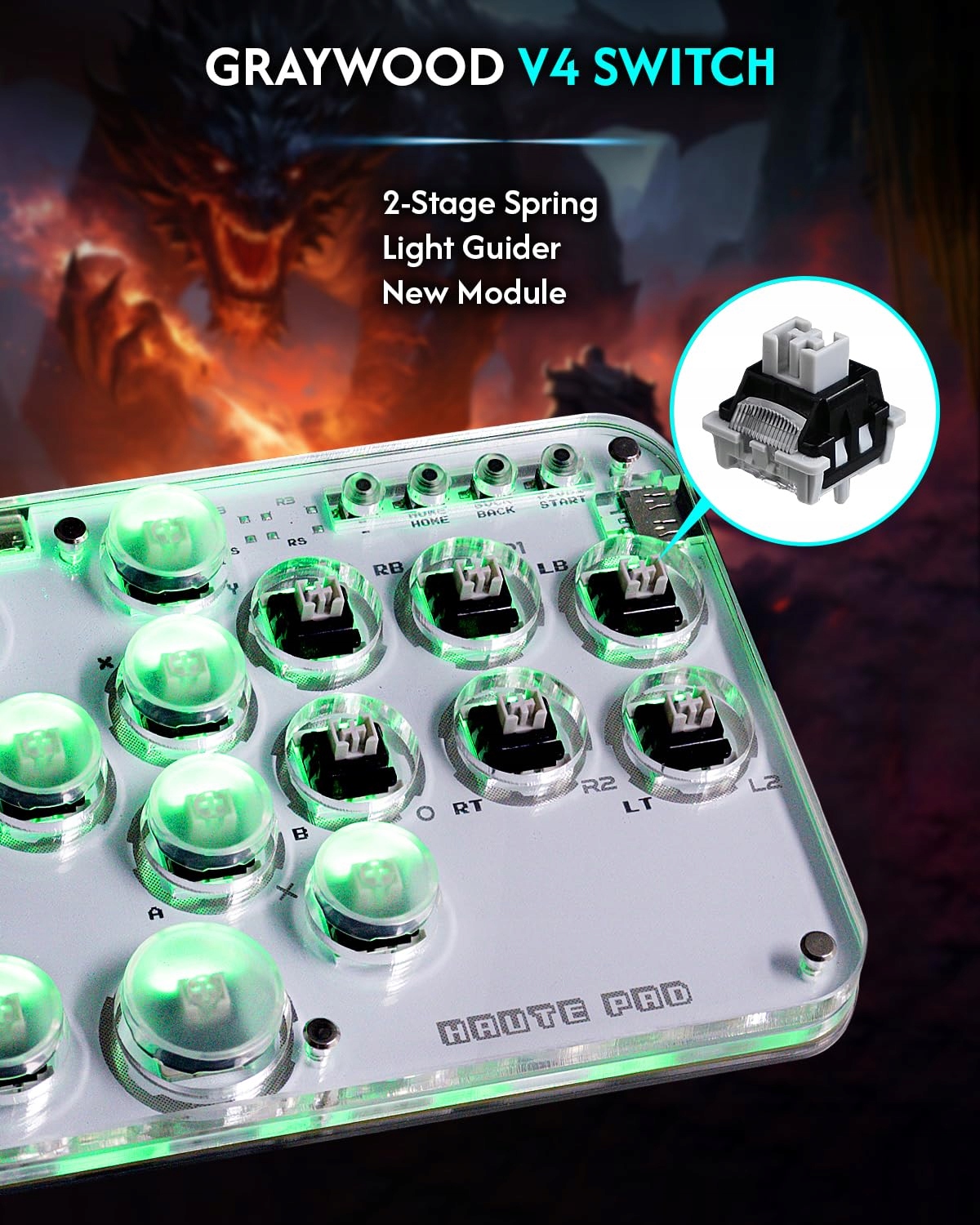 Функция продукта: 5 режимов контроллера - режим ввода X/режим переключения/режим ввода PS3/D/режим PS4/режим клавиатуры. Несколько режимов очистки SOCD, функции Turbo, встроенная веб-настройка, переставляемые кнопки, порт EXT, специальные колпачки клавиш M1/M2.
