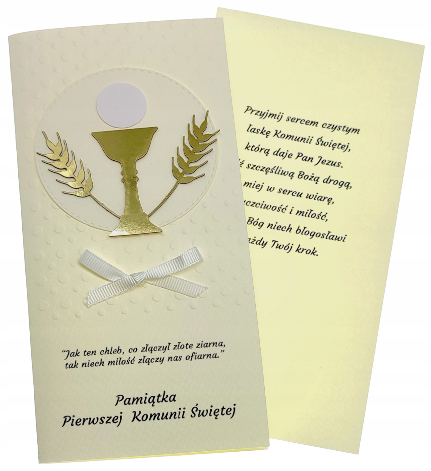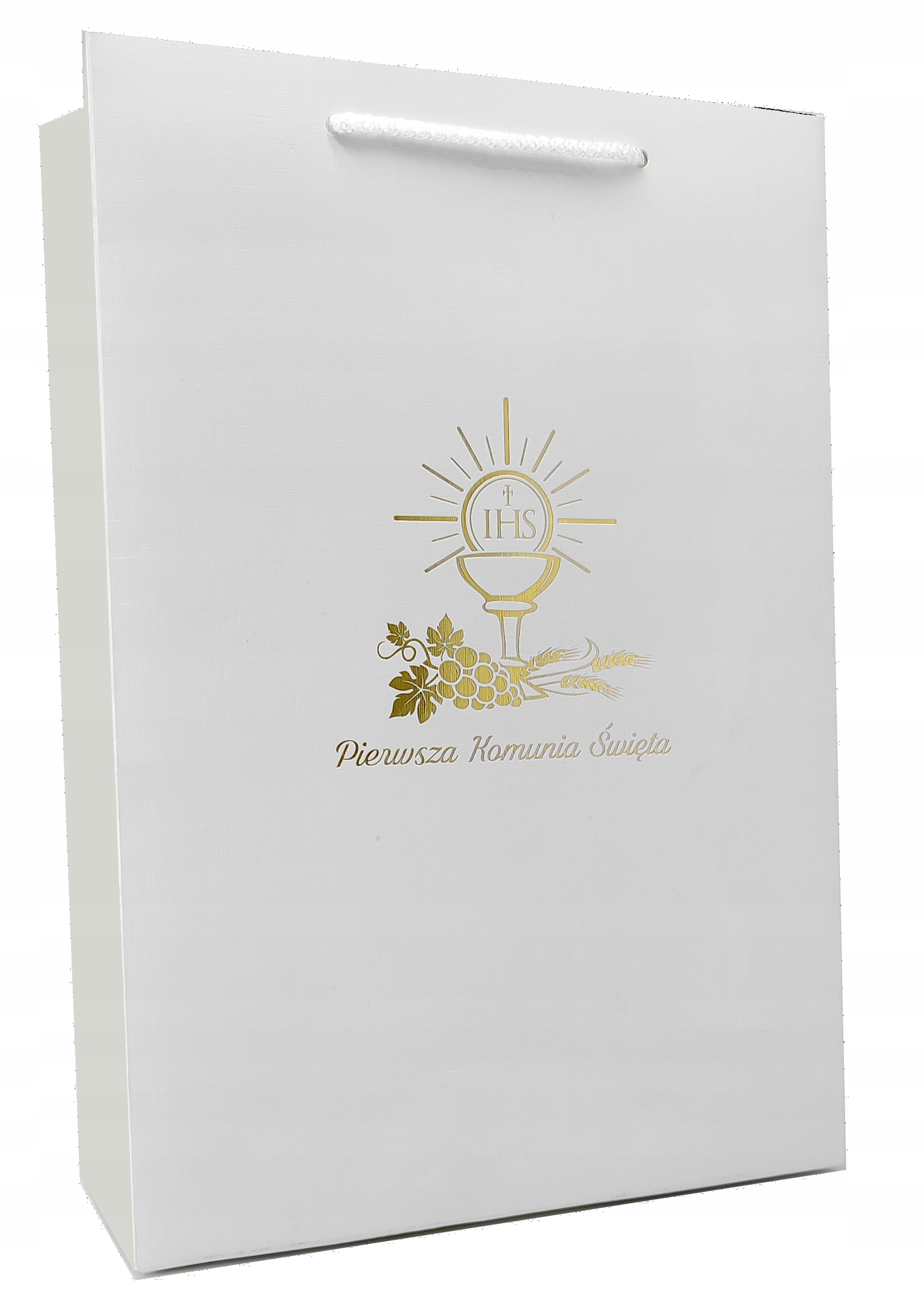 Наша новинка идеально подходит для празднования Первого Причастия. Подарочный пакет отличается нежным белым оттенком и золотым декором. На изделии имеется надпись «IHS Первое Святое Причастие».