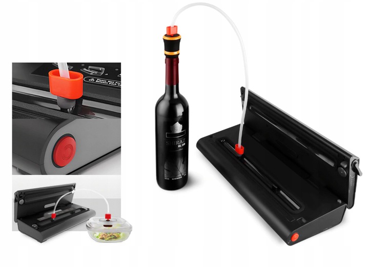 Благодаря входящему в комплект шлангу можно герметично упаковывать продукты в вакуумных контейнерах. . Такие контейнеры имеют уплотнители и клапан давления, благодаря которому мы можем выровнять давление в боксе.