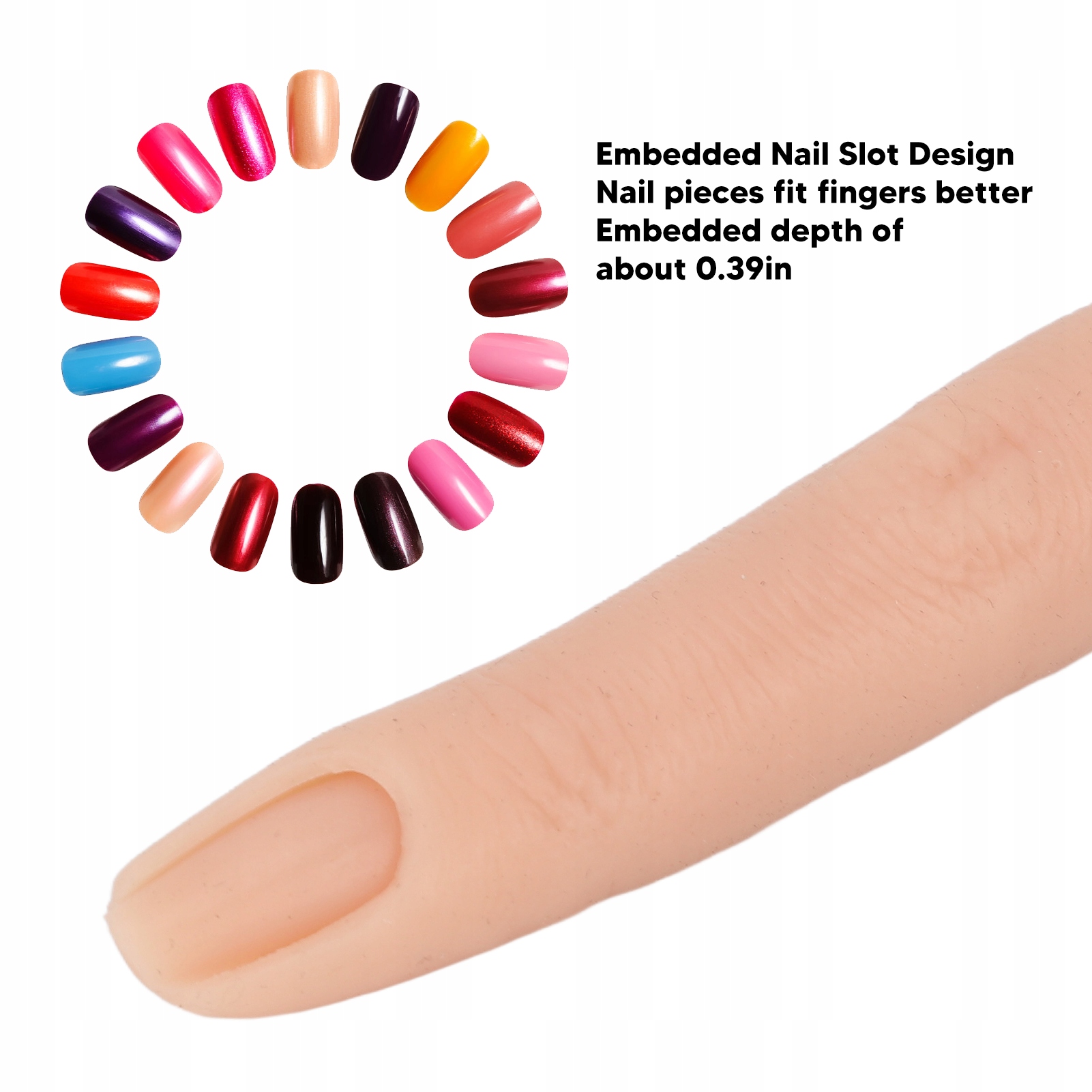 4. ВСТРОЕННЫЙ ДИЗАЙН: встроенный дизайн пазов для ногтей, практикуйте маникюр с кусочками ногтей, которые лучше подходят вашим пальцам, глубина вставки около 10 мм/0,39 дюйма.