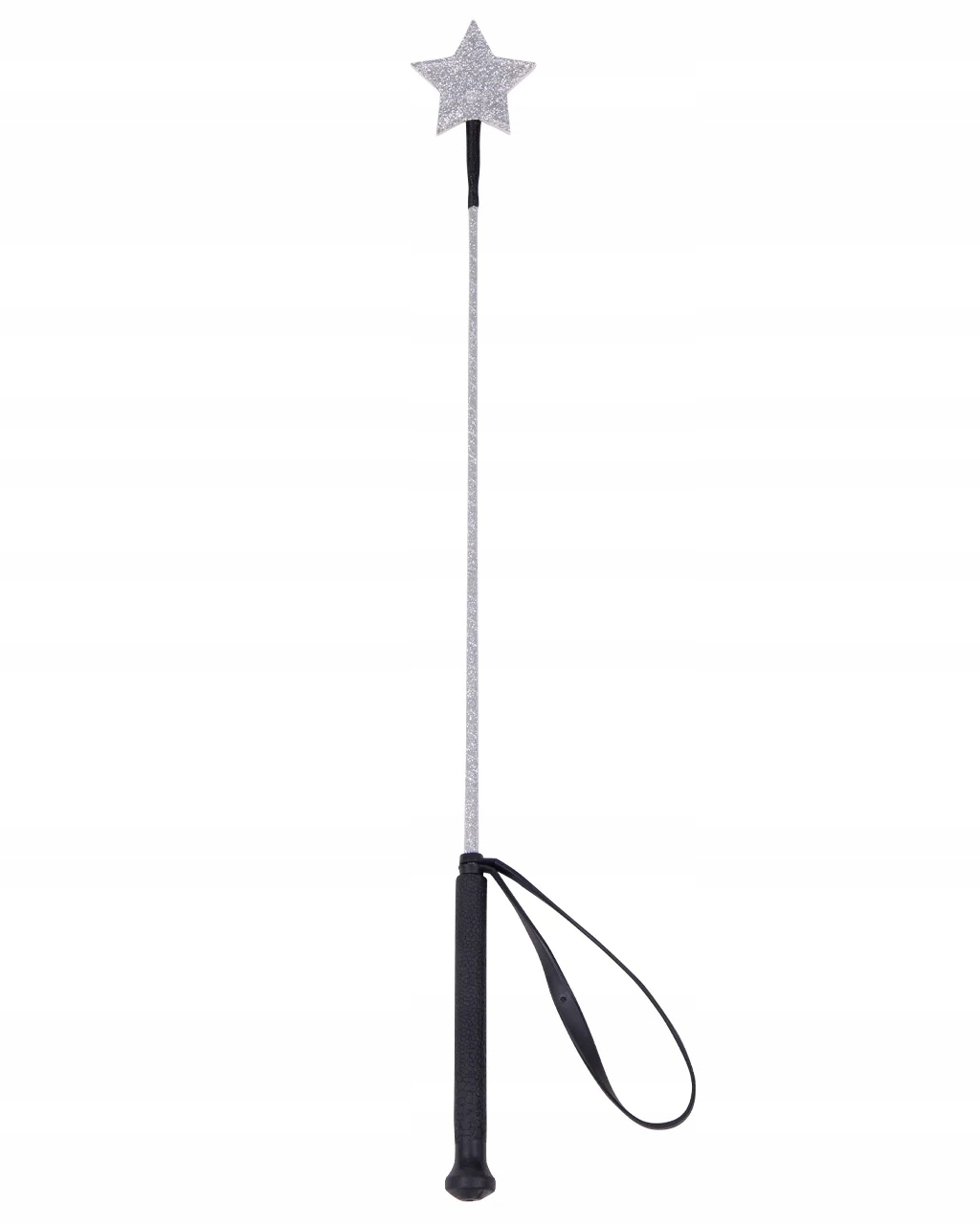 На конце хлыста имеется декоративная звезда, выполненная из того же блестящего материала, которая придает уникальный характер и не только красива, но и хорошо заметна. Палкат имеет стандартную длину 65 см, что делает его пригодным для участия в конных соревнованиях.