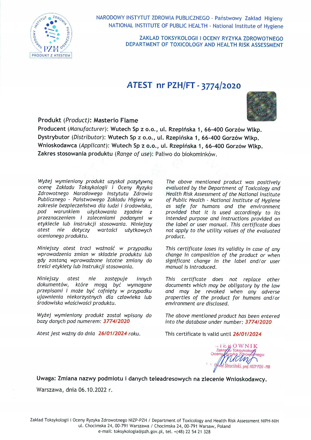 Биотопливо Masterio Flame имеет действующий сертификат PZH