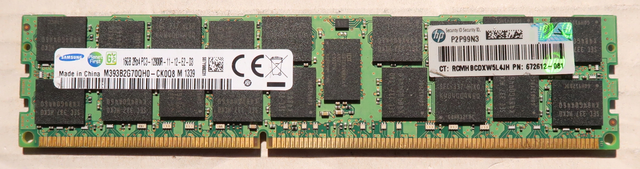 Полностью рабочая «серверная» память 16 ГБ DDR3 PC3-12800R 1600 МГц ECC-Registered RDIMM SAMSUNG M393B2G70QH0-CK0Q8 (16 ГБ в одном кристалле).