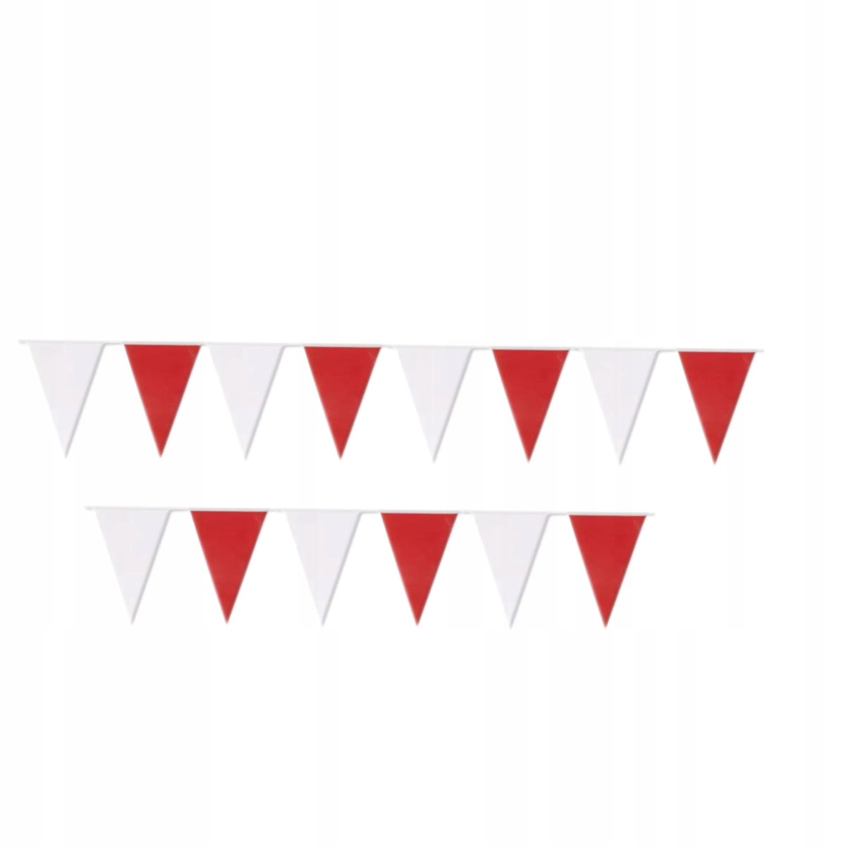 Декоративная гирлянда, состоящая из белых и красных треугольных вымпелов, является прекрасным декоративным элементом для различных случаев.