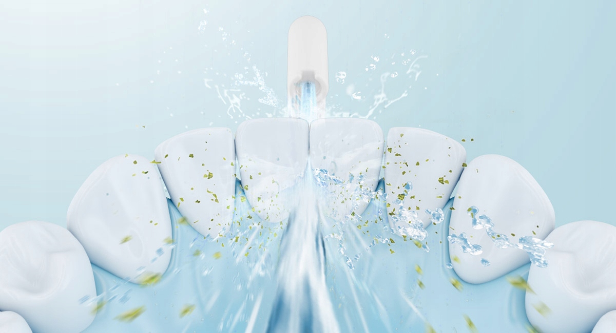 Поток воды смывает остатки пищи из труднодоступных для зубной щетки мест (например, в случае ортодонтических мостов) и между зубами.