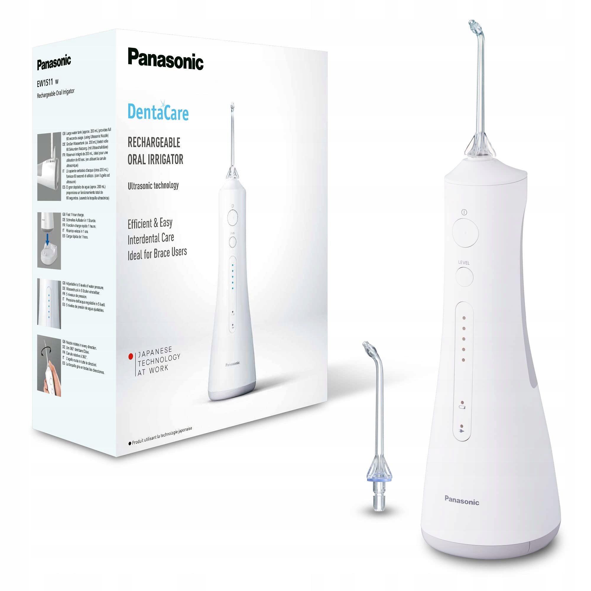 Название продукта: Panasonic Ultra Sonic EW1513 Электрический ирригатор для рта, для межналенной очистки, интегрированная зарядная станция, 1 X Ultrasonic сопла, 1 x ортодонтическое сопло, белое
