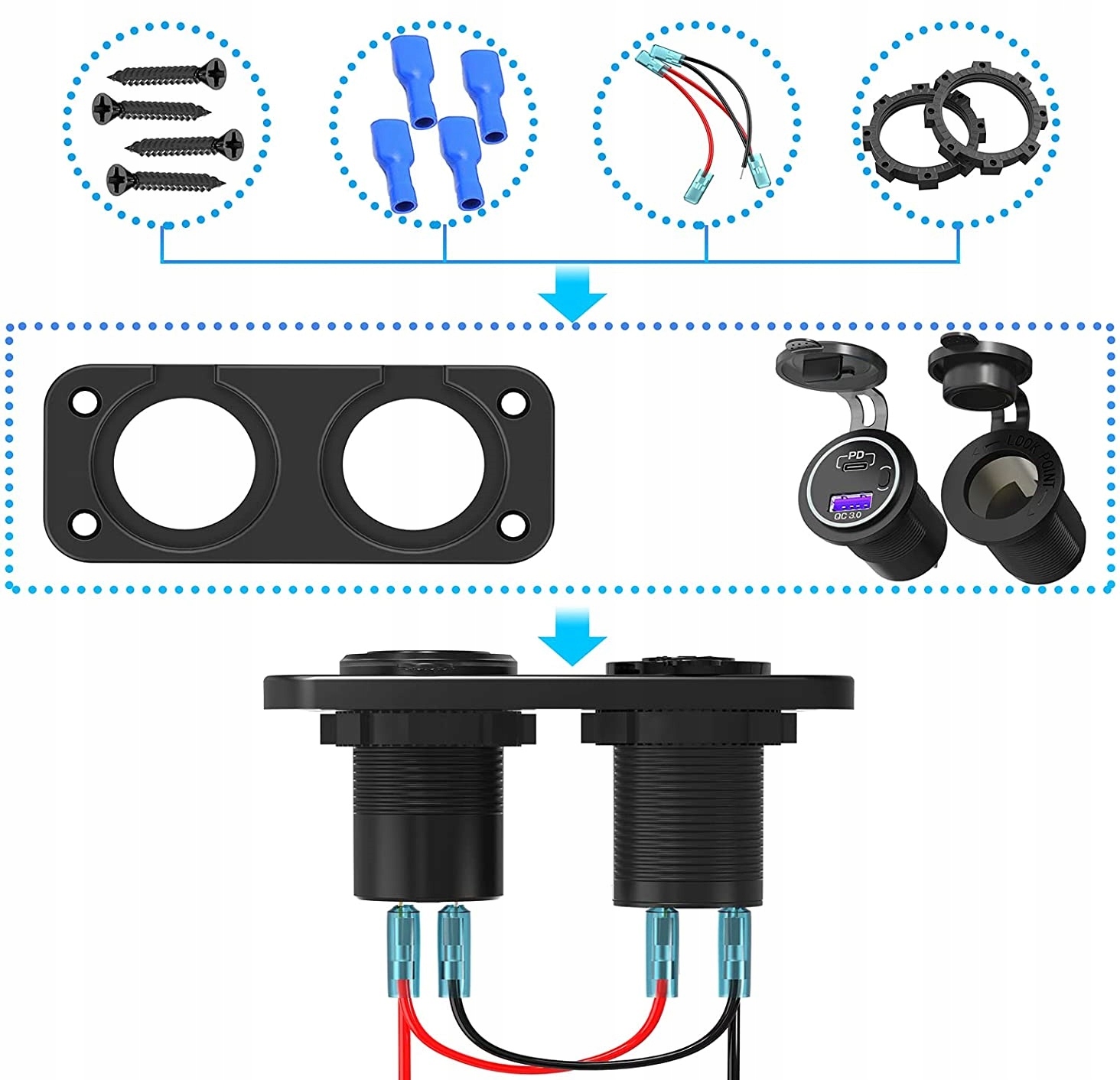 Панель состоит из более легкого сокета и двух портов USB быстрой зарядки QC3.0 + PD