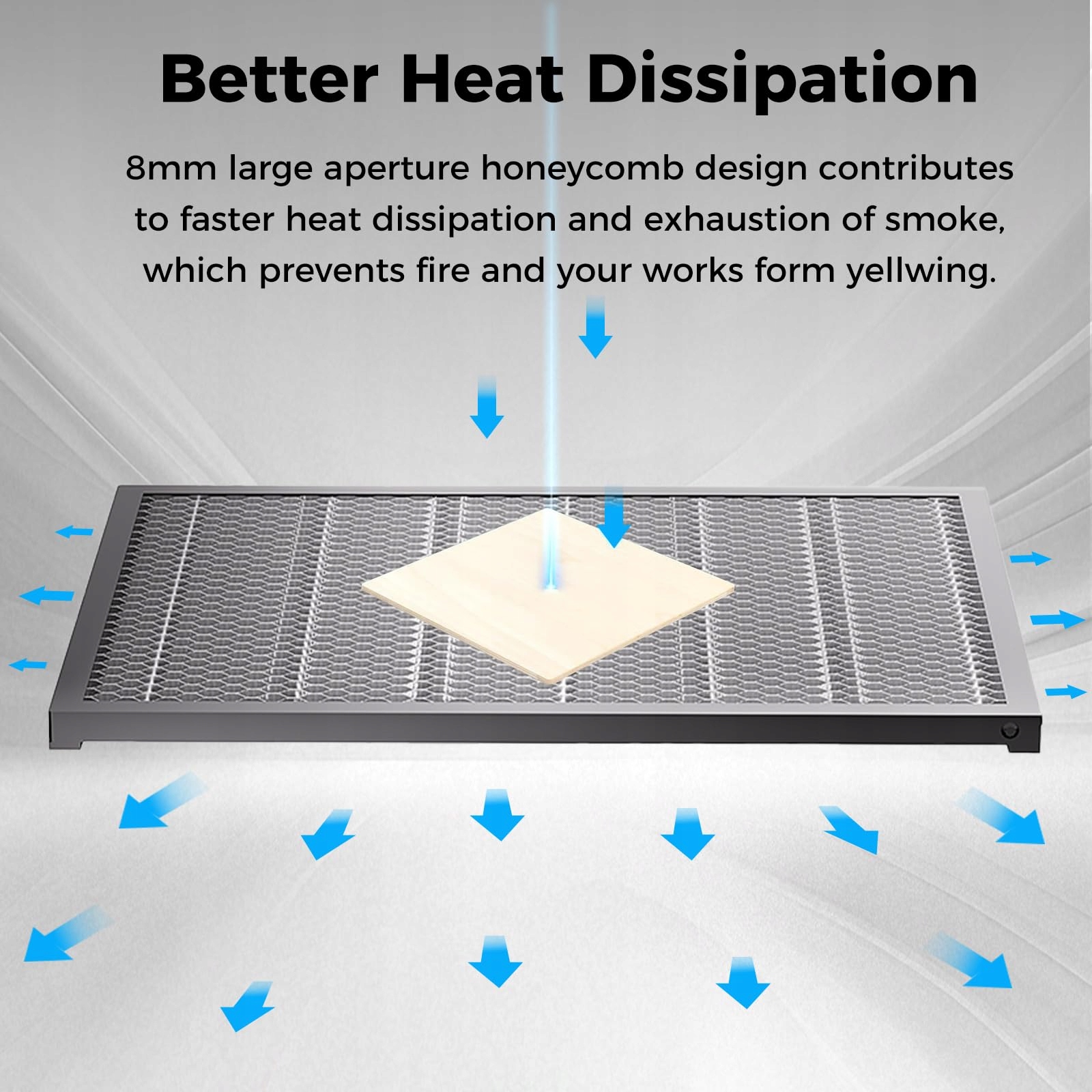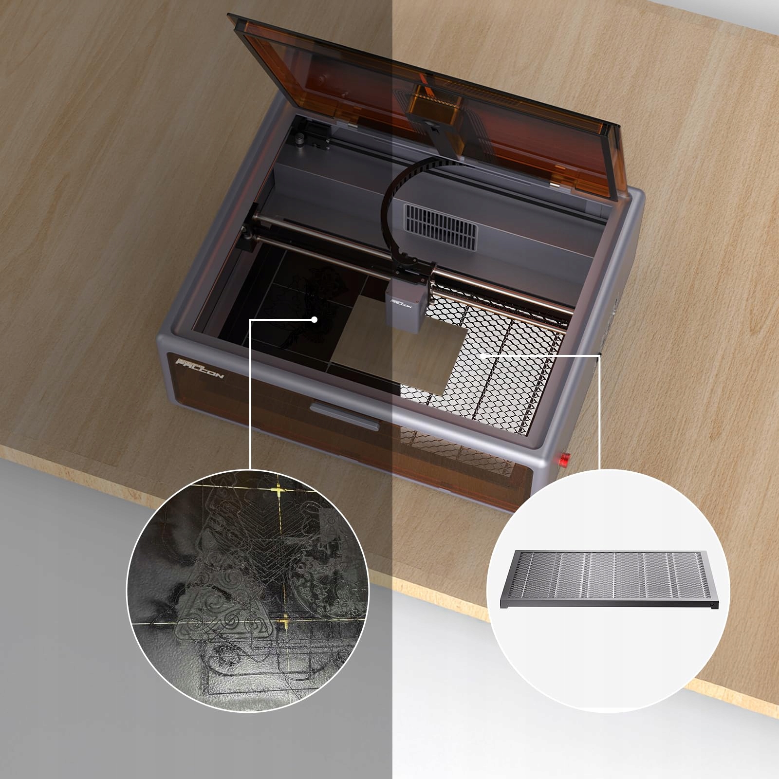 Сотовая панель не только поглощает и отклоняет лазерный свет и загрязнения, но также предотвращает выгорание, защищая вашу работу. Сотовидная платформа в сочетании с алюминиевой пластиной предотвращает повреждение столешницы и имеет четыре съемных защитных угла для защиты пользователя от царапин.