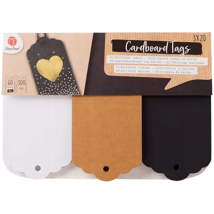 подвески, билеты и картины - это эстетическое и уникальное дополнение к подаркам. Вы можете добавить несколько хороших слов или предоставить информацию, для которой подарок предназначен. Сделано из бумаги с сертифицированной FSC: бумага, полученная сбалансированным образом. В упаковке из 60 штук, упакованных в 3 цвета (белый, коричневый, черный). Подвески имеют размеры: 7 х 15 см (ширина, высота). Каждая метка имеет отверстие с диаметром 5 -ммдо резьбовой строки, ленты или другого монтажного элемента.