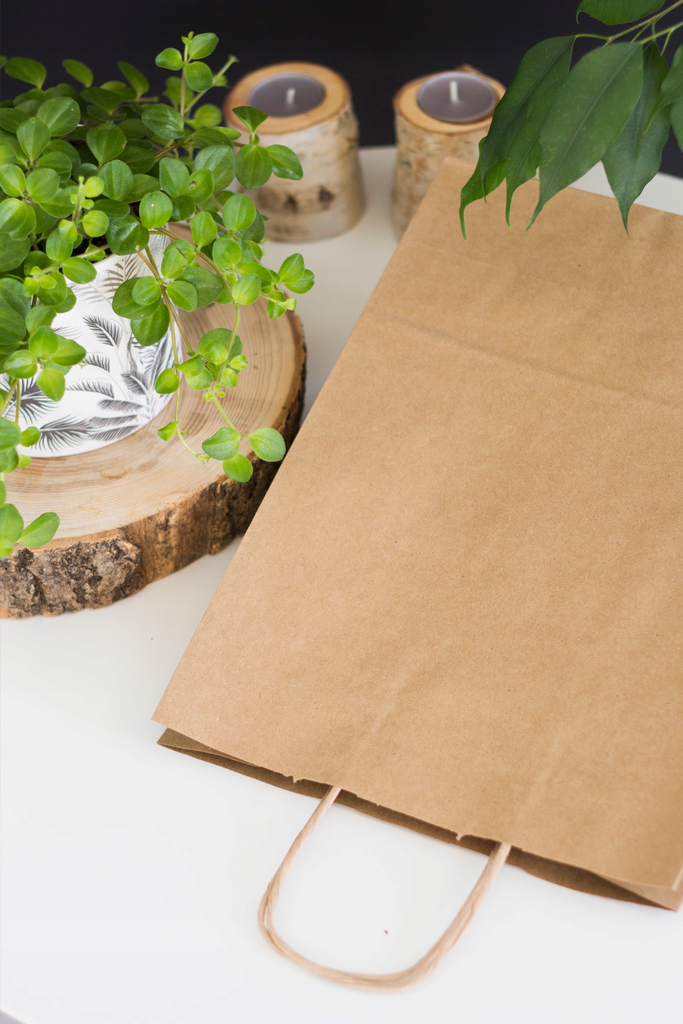 Бумажные пакеты с плоскими ручками изготовлены из коричневой бумаги KRAFT, ручки пакетов вклеены внутрь пакетов.