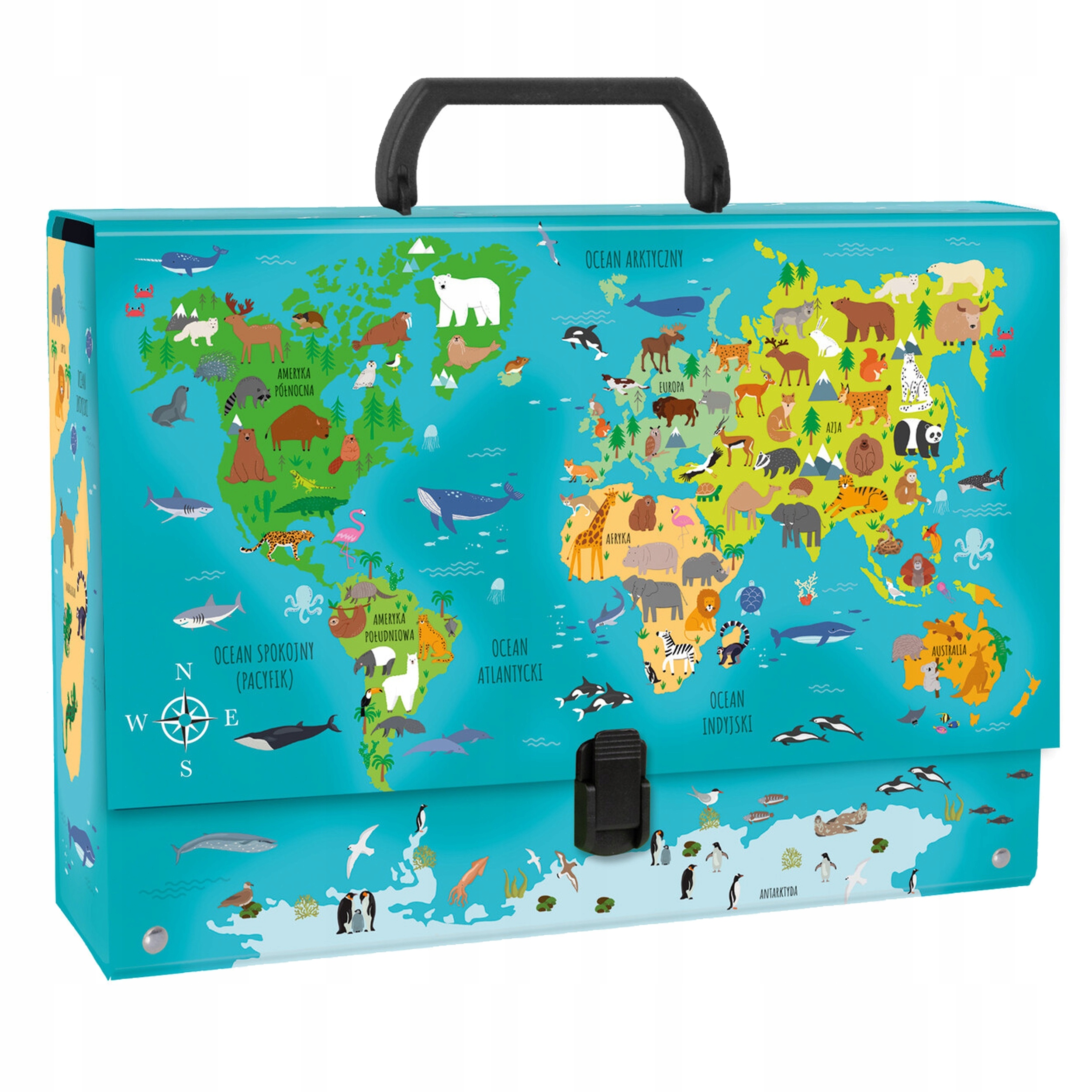 Жесткая папка А4 с ручкой, плотная, Карта мира, животные.