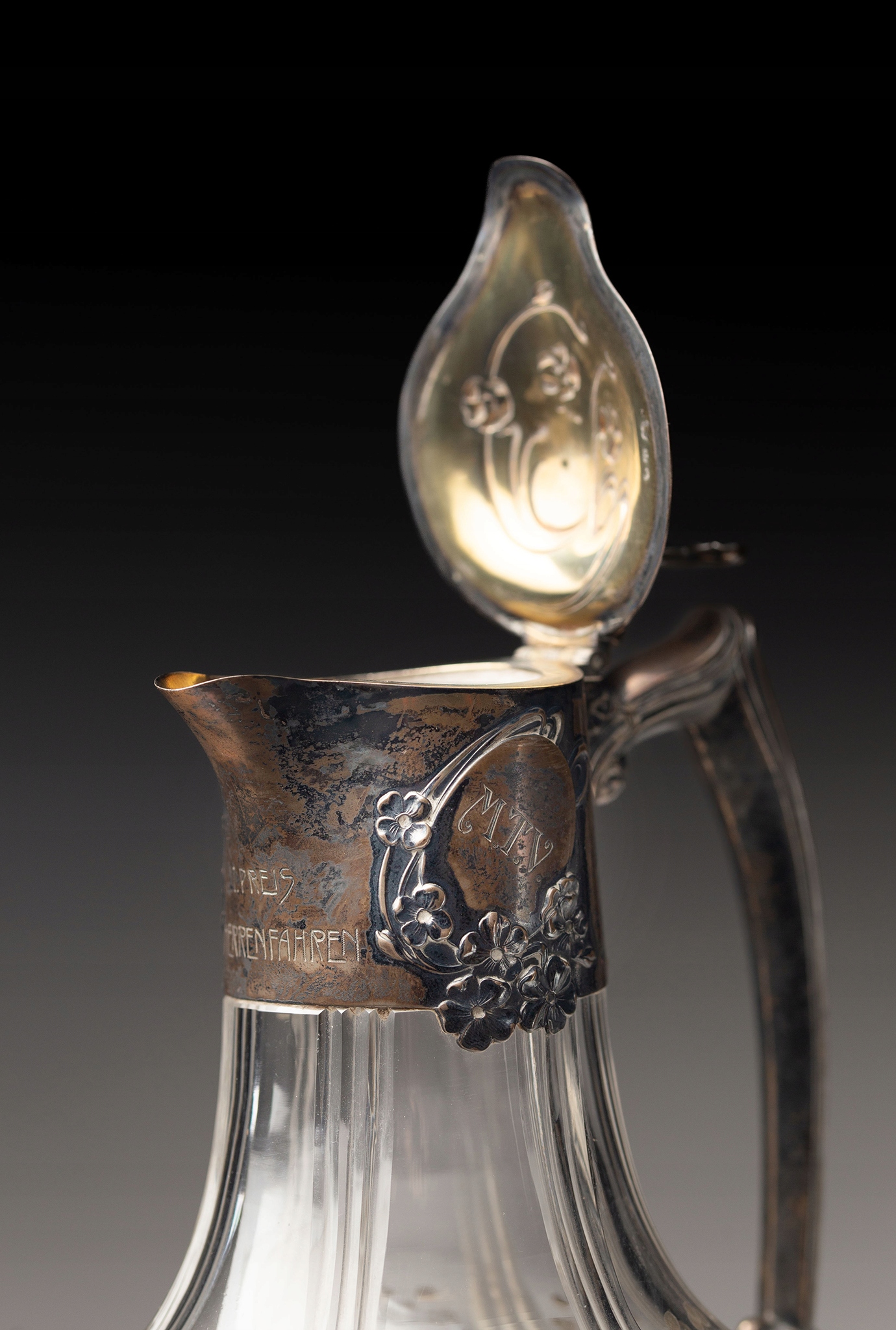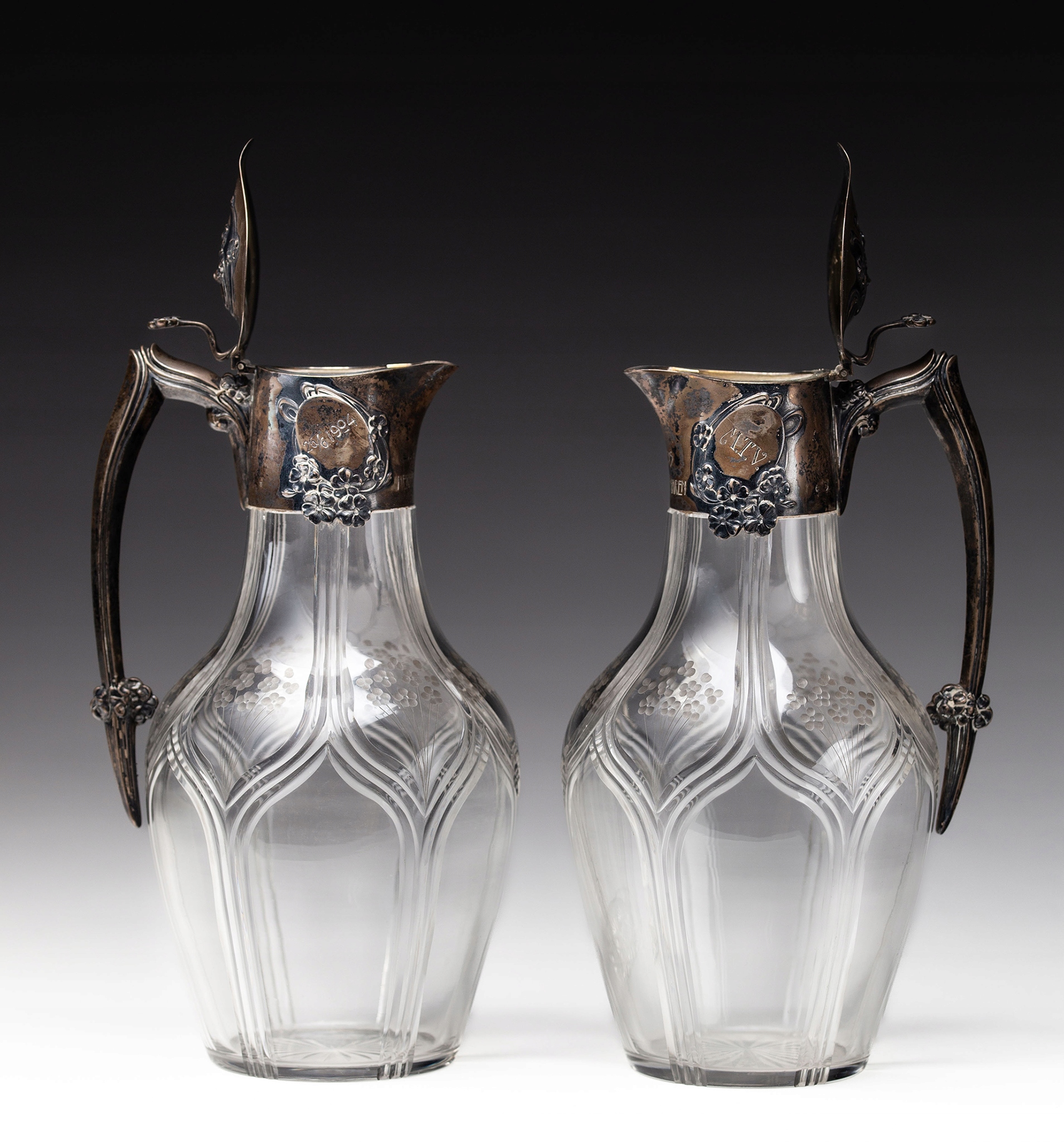Пара чрезвычайно эффективных, художественных кувшинов для вина, сделанного из бокала и серебра из 950 образцов Венского Голдсмита Йозефа Карла Клинкоша. на круглом основе стекло, потрескавшееся в верхней части живота с узкой шеей. Украшенный геометрическим отшлифованным рисунком, достигнутым от основания до самого верха, на полях на дерьмовой части живота с украшением мелких цветов. Установка наполнителя и ручка из 950 серебра, украшенная маленькими цветами, напоминающими настурцию и его лианы. Длинная и тонкая ручка с декоративным питанием на протяжении всей своей длины, в сочетании с животом в виде куча цветов. На передней части обеих фитингов надпись «1 Preis | Herrenfahren». По бокам Овалы, в одном из них инициалы «М.Т.В.» Во второй дате "26/06 1904". Он покрывает на одном шарнире аналогичным украшением цветом с настуртом и ручкой, которая в виде ES, в виде двух цветов. Стекло ручной бокалы с синатовыми и цветочными украшениями, последовательными и сходится с украшением серебряных элементов. Все украшения - стеклянные и серебряные элементы являются квинтэссенцией венского отделения с начала 20 -го века