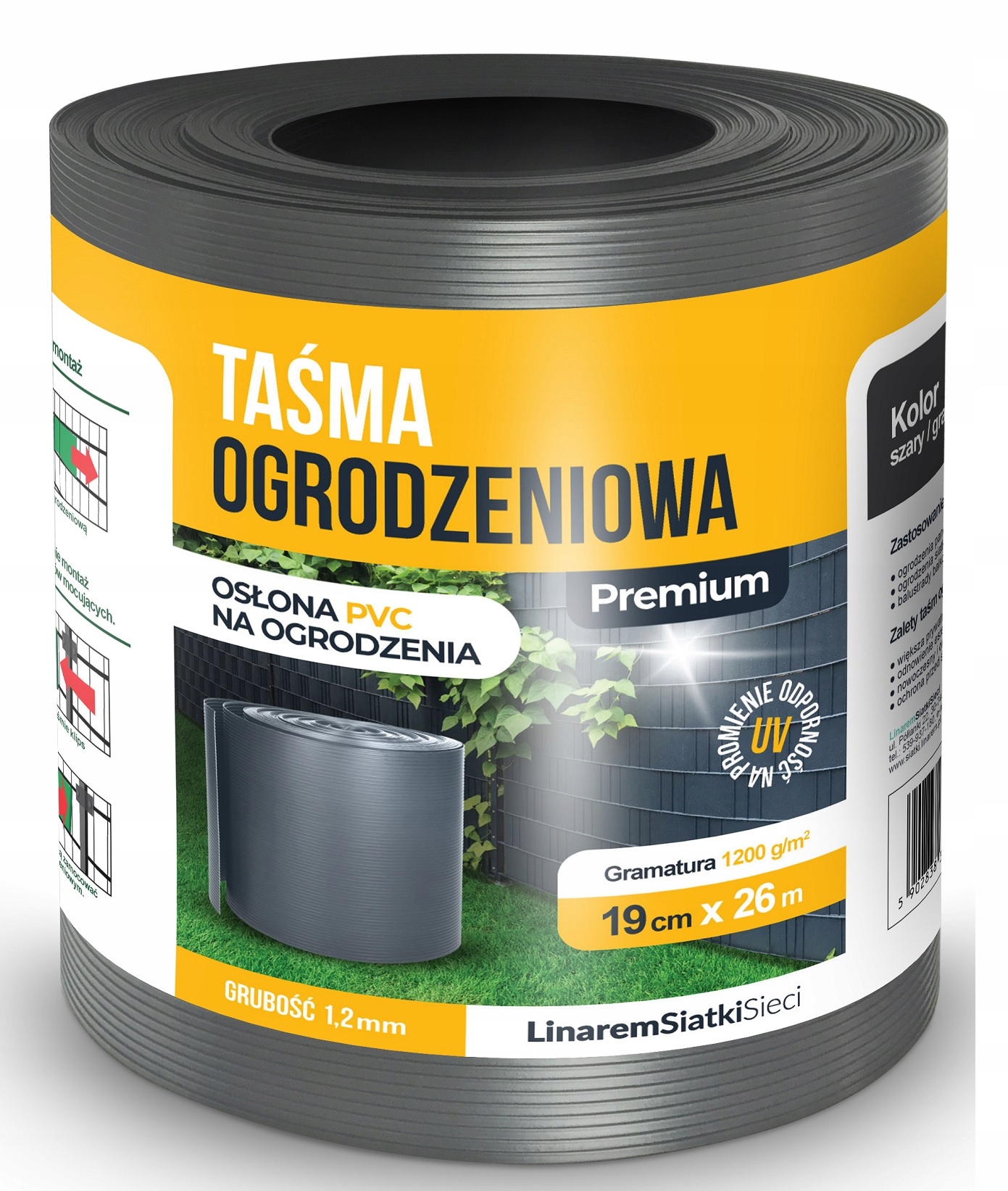 - ВЕС И УСТОЙЧИВОСТЬ К УФ-УФЛУ: самый высокий вес ленты для ограждений на польском рынке, 1200 г/м2, позволяет использовать большей доли УФ-фильтра по отношению к весу изделия, благодаря чему лента ПВХ ПРЕМИУМ дольше сохранит свои свойства.