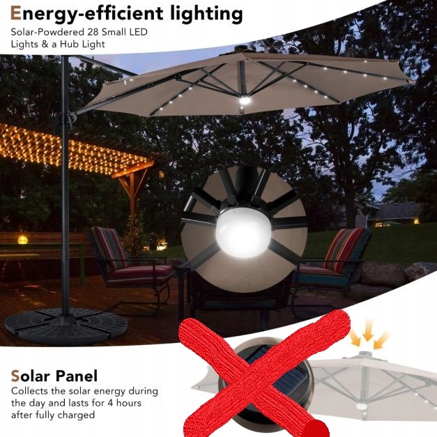 Романтическая светодиодная панель и энергосберегающая солнечная панель: зонт для патио оснащен 24 встроенными светодиодными лампочками, которые будут освещать ваш внутренний дворик, когда наступит ночь. Мягкое освещение создаст для вас романтическую атмосферу. Кроме того, все светодиодные лампы питаются от солнечных батарей наверху, чтобы экономить энергию, сохраняя при этом отличное освещение.