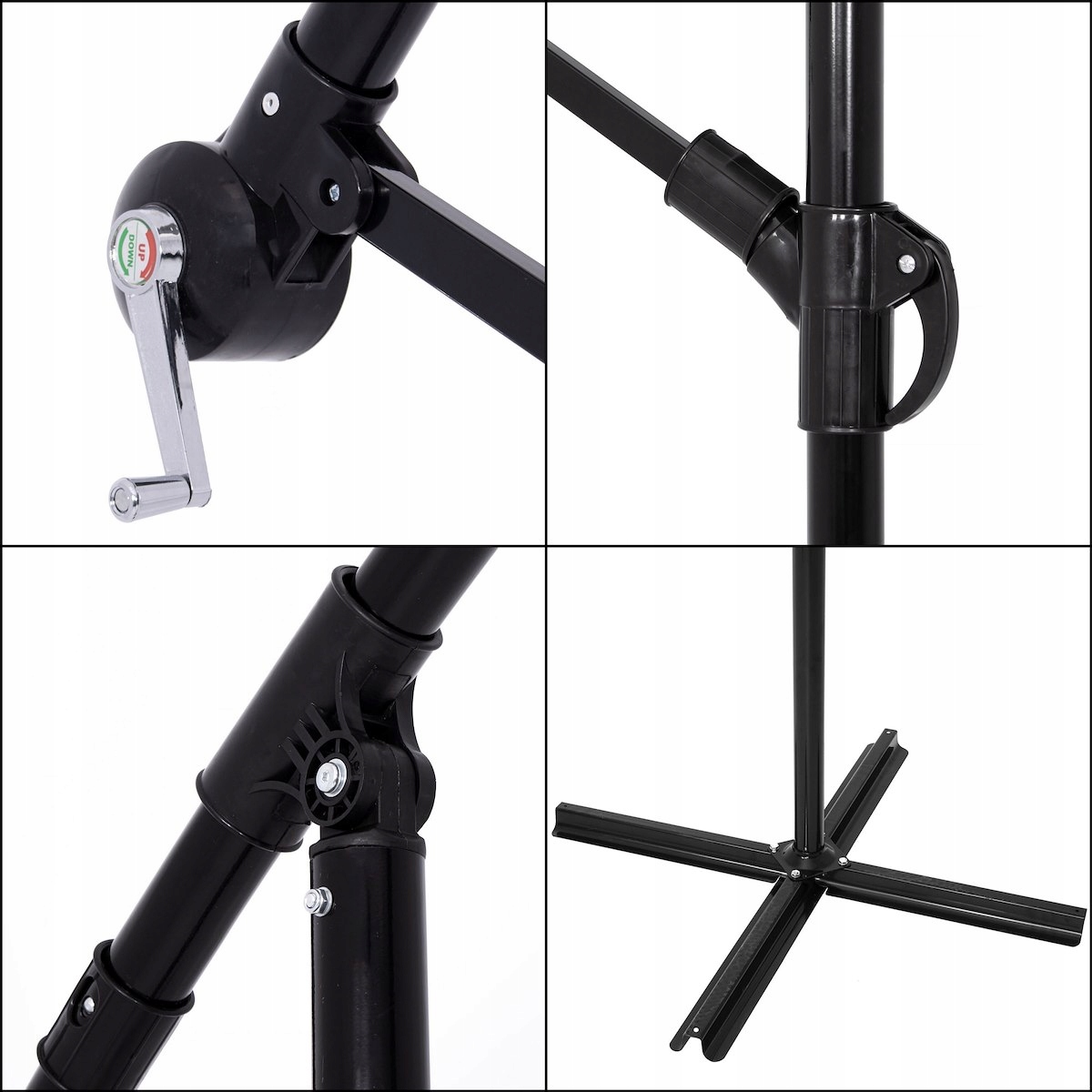 Для повышения устойчивости и безопасности, например, при неожиданных порывах ветра, зонт оснащен широким основанием с размахом до 100 см. Кроме того, каждая из его ножек оснащена отверстиями, благодаря которым вы можете использовать анкеры или специальные винты, предназначенные для данной поверхности, чтобы надолго закрепить основание в удобном месте. Форма базовых элементов также позволяет придать им соответствующий вес, если вы считаете это более подходящим решением.