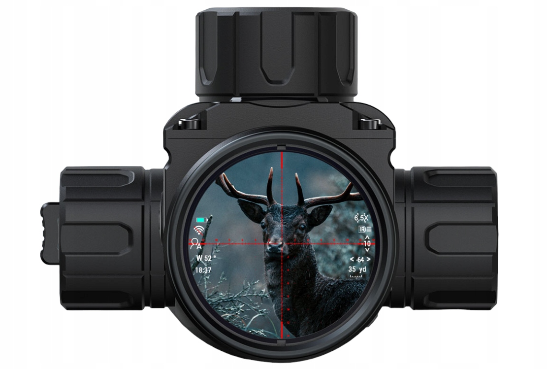 Тело предлагает в общей сложности шесть элементов управления. В дополнение к фокусировке глаз и объектива корпус устройства имеет селектор вращения и три кнопки. Повернув влево, направо, нажимать, двойное нажатие и нажатие длинного. Например, благодаря трем действиям вы можете изменить цветовые режимы, активировать баллистический калькулятор, записать видео, сфотографировать или адаптировать яркость освещения