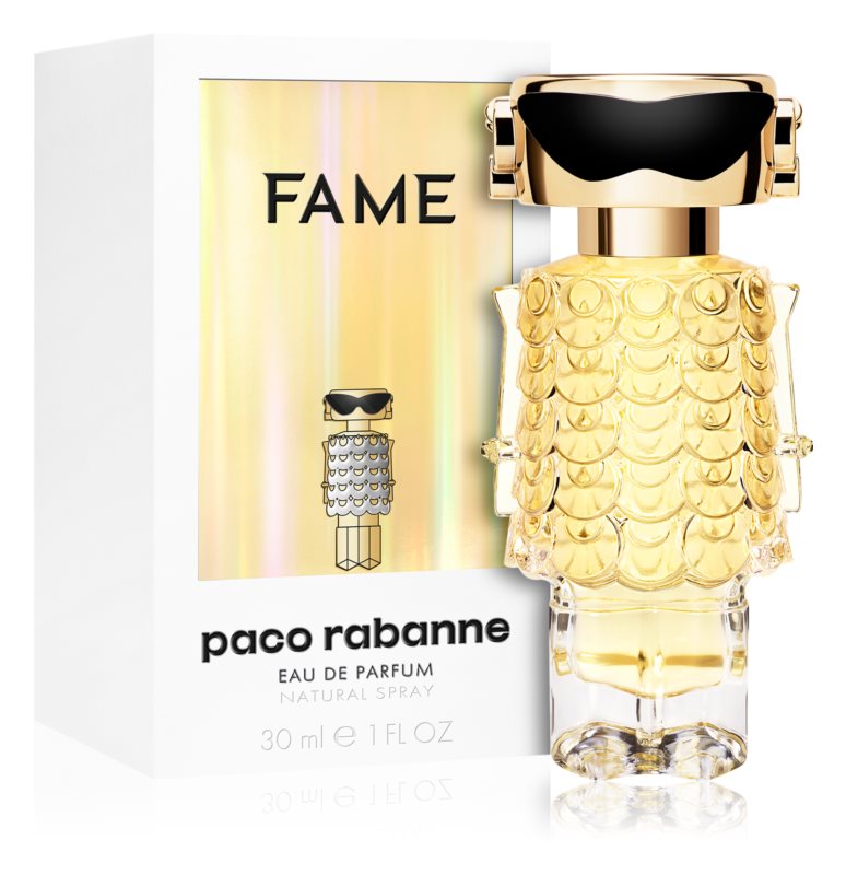 Флакон аромата Fame напоминает драгоценный камень. Его дизайн отражает авангардный стиль модных творений Пако Рабанна. Перед этой бутылкой невозможно устоять, как и перед культовой сумкой Paco Rabanne 1969 года. Серебряные акценты на золотой основе ассоциируются с игривыми, ультрасовременными платьями с металлическими украшениями, которые в прошлом носили многие иконы моды.