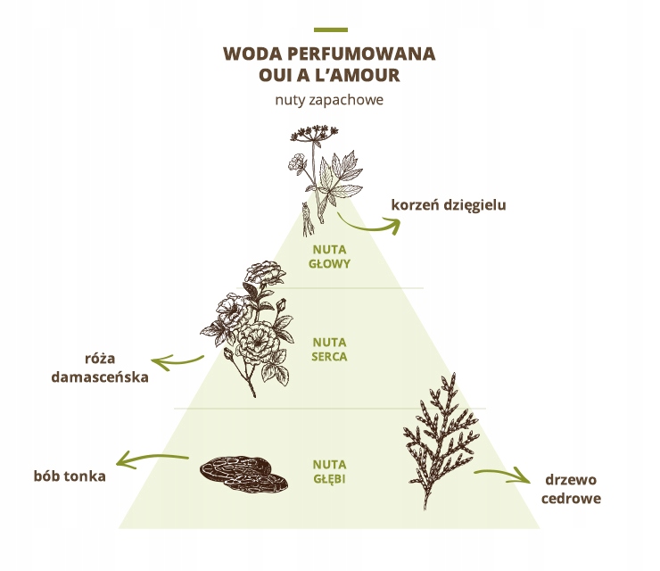 Романтичность по мнению Софи Лаббе выражается не только цветочными, сладкими тонами. Издание Yves Rocher также означает свежесть, чувственность и элегантность. В Oui a l'Amour также доминируют изначально менее заметные тонкие ароматы эфирных масел розы и характерных пряных нот, мускуса и амбры.