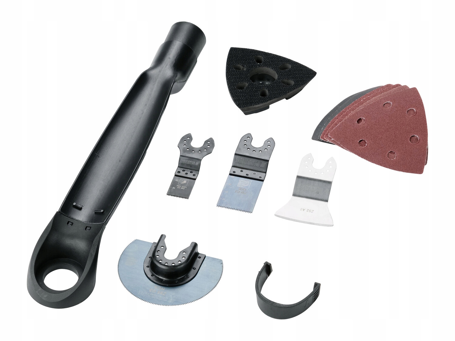 - принадлежности в комплекте: 2 погружных пильных полотна, 1 сегментное пильное полотно, 1 скребок, 1 дельта-шлифовальная пластина, 18 шлифовальных дисков, 1 канал пылеудаления