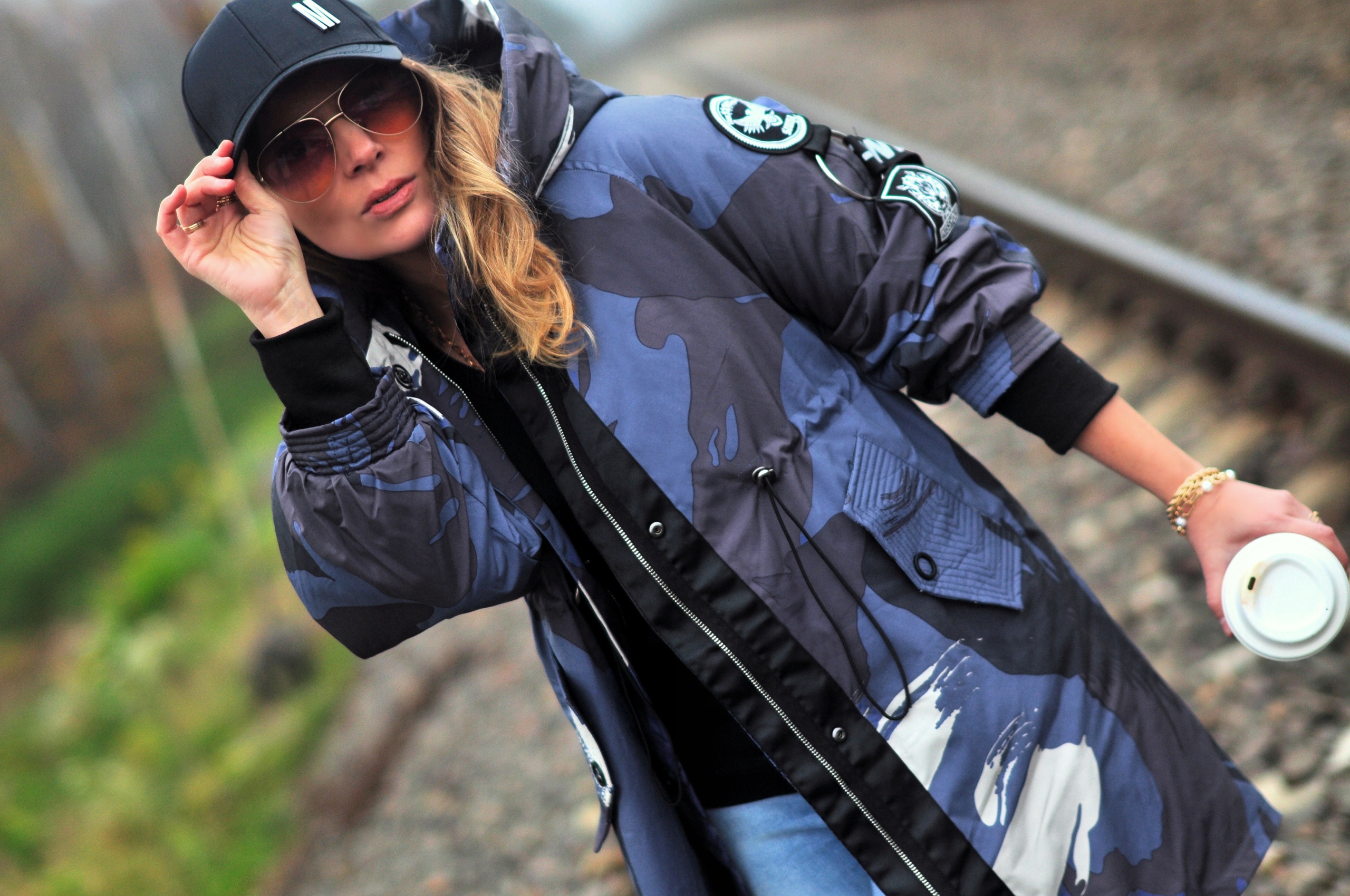 Длинная камуфляжная ПАРКА в СИНИХ оттенках застегивается на молнию.