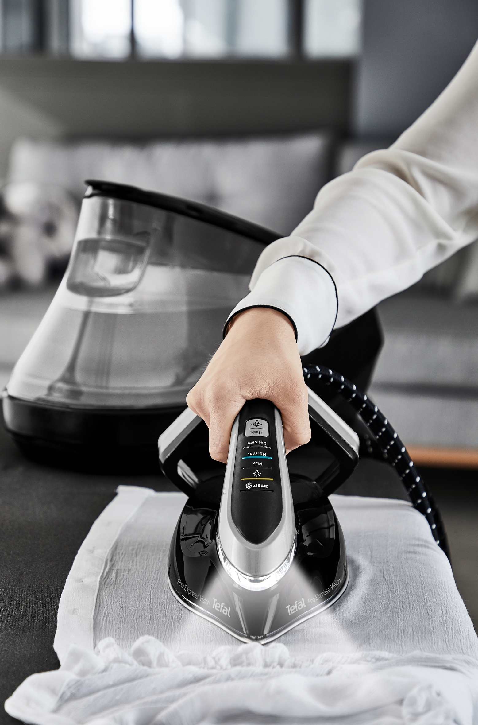 Уход за тканями еще никогда не был таким простым: парогенератор Tefal Pro Express Vision обеспечивает мощность, отвечающую всем вашим потребностям, а благодаря передовым технологиям вы можете без усилий наслаждаться идеальными результатами. Устройство оснащено системой Smart LED Vision — светодиодной подсветкой, расположенной на носике утюга, которая включается автоматически, когда утюг находится в горизонтальном положении. Это инновационное решение повышает точность глажки даже в плохо освещенных помещениях, каждый раз обеспечивая идеальные результаты. Эта гениальная конструкция сочетается с исключительной эффективностью пара: непрерывной подачей пара 180 г/мин при давлении 9 бар и подачей пара 800 г/мин, что обеспечивает исключительно легкое разглаживание стойких складок. Наслаждайтесь устройством 2-в-1: используйте его как классический утюг для длительной глажки или используйте пар для подкраски в последнюю минуту.