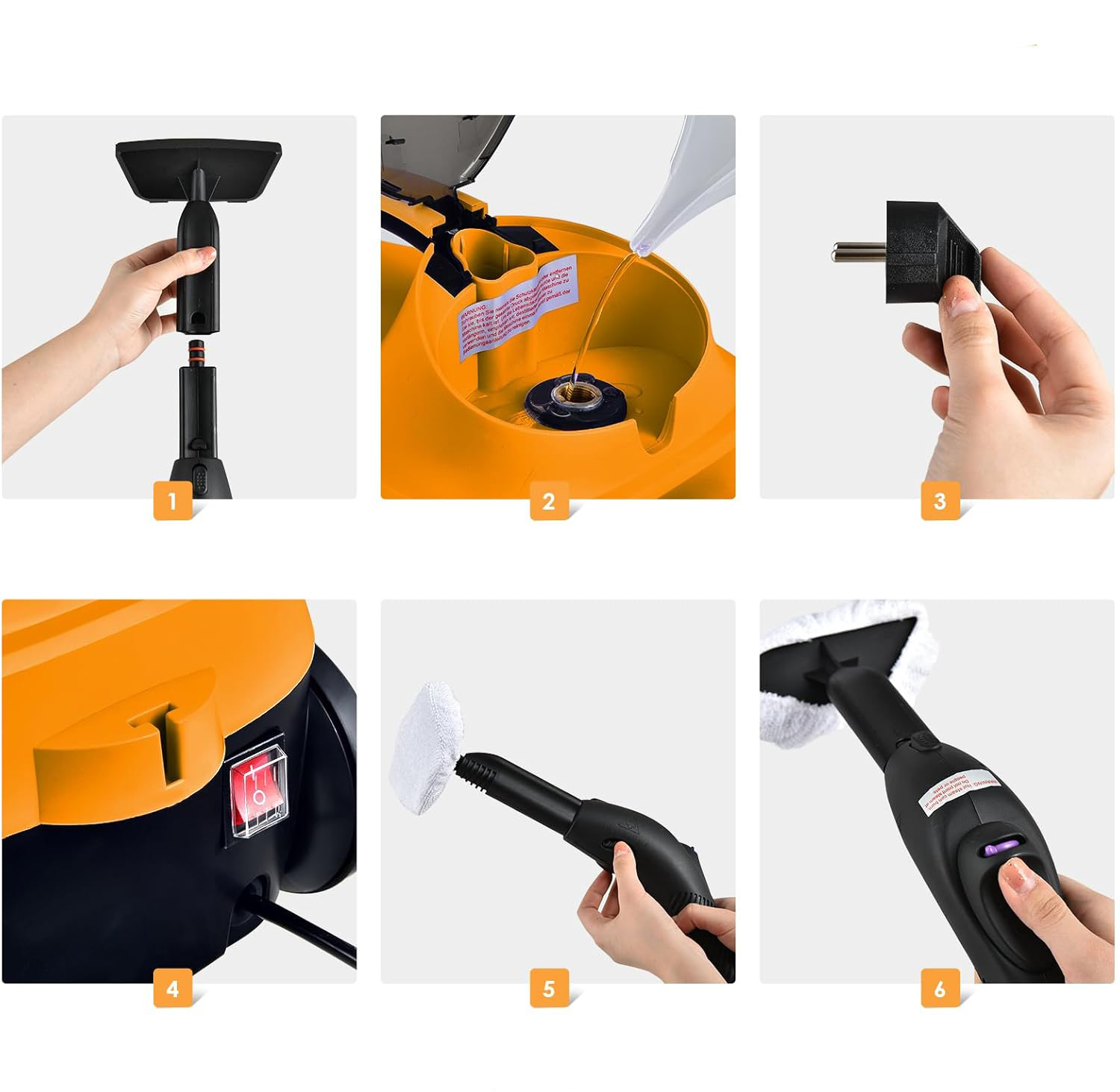 ➡️ Непрерывная очистка и большой резервуар: перед использованием пароочиститель необходимо предварительно прогреть в течение 5–6 минут. Благодаря резервуару для воды объемом 1,5 л пароварка может работать ок. От 30 до 45 минут. Когда воды нет, загорается красный светодиод, чтобы вы могли вовремя долить воду. Кроме того, пароочиститель имеет функцию непрерывной подачи пара, благодаря которой пар выходит непрерывно, без необходимости нажимать на курок.