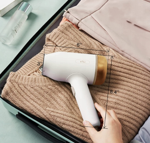 Портативный отпариватель для ткани: идеальный размер 21 x 15 x 7,5 см. Легкий вес делает его идеальным спутником в путешествии; Резервуара для воды емкостью 120 мл достаточно для более чем 10 минут непрерывного приготовления на пару.